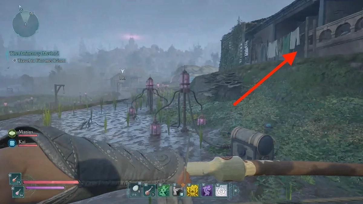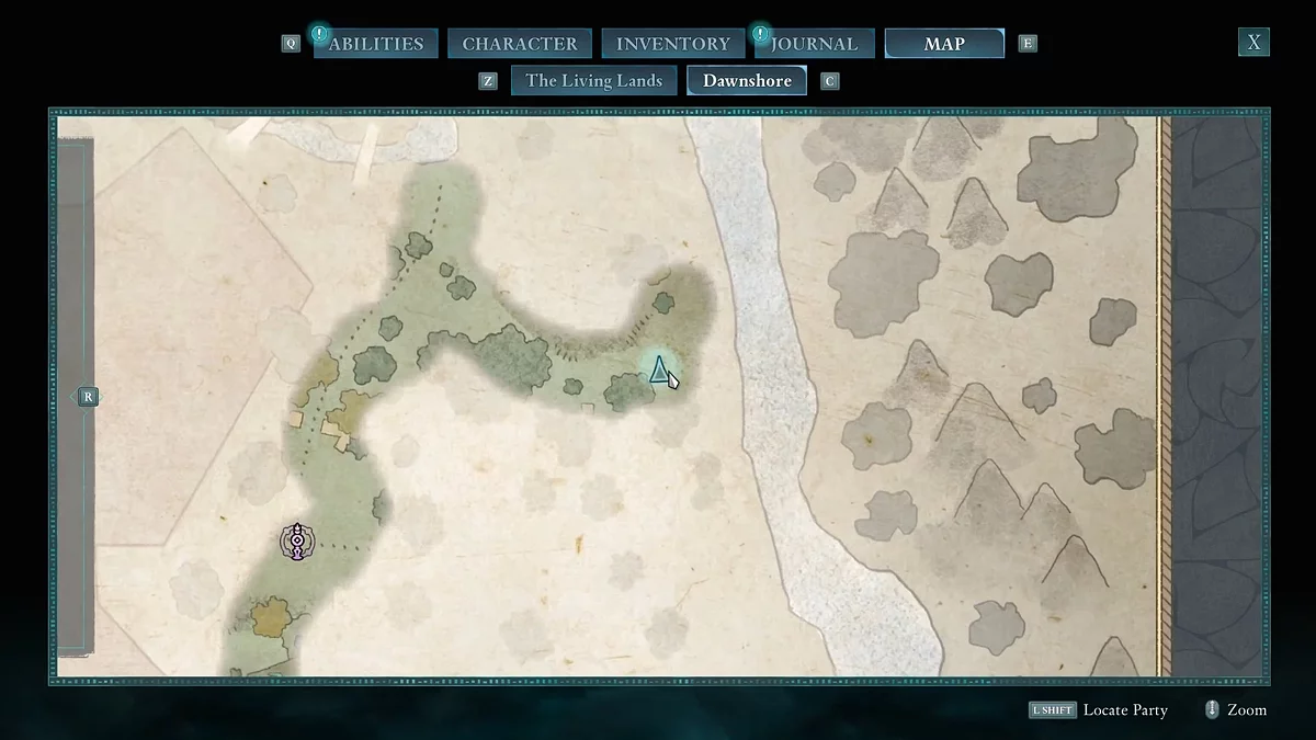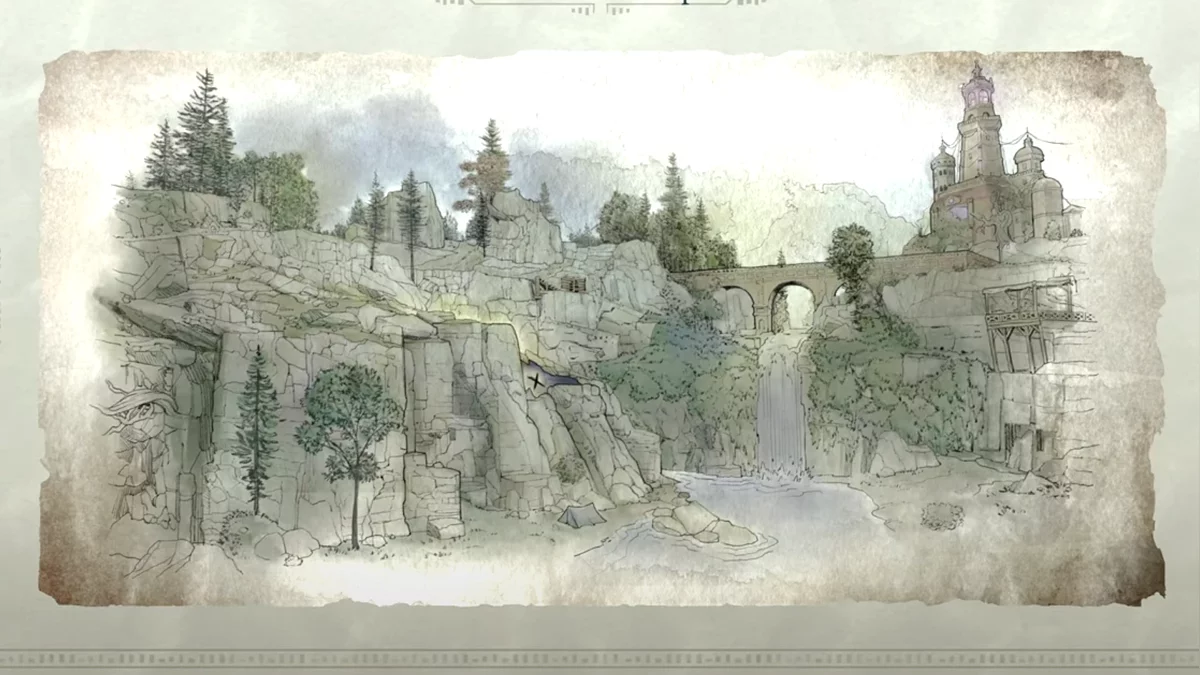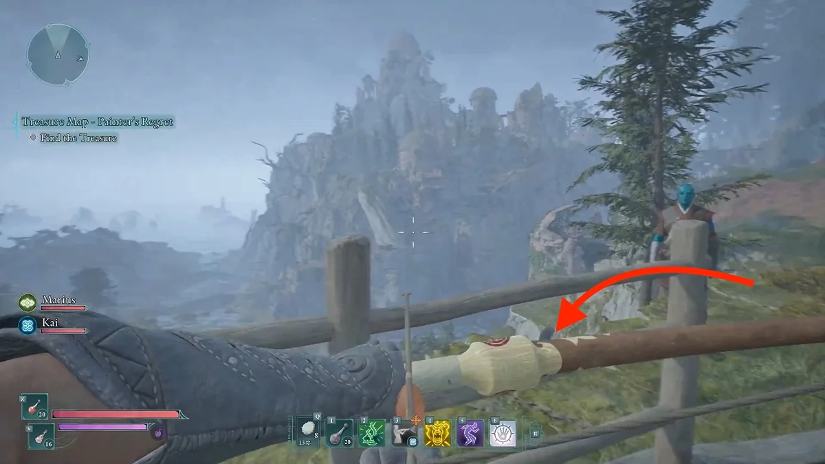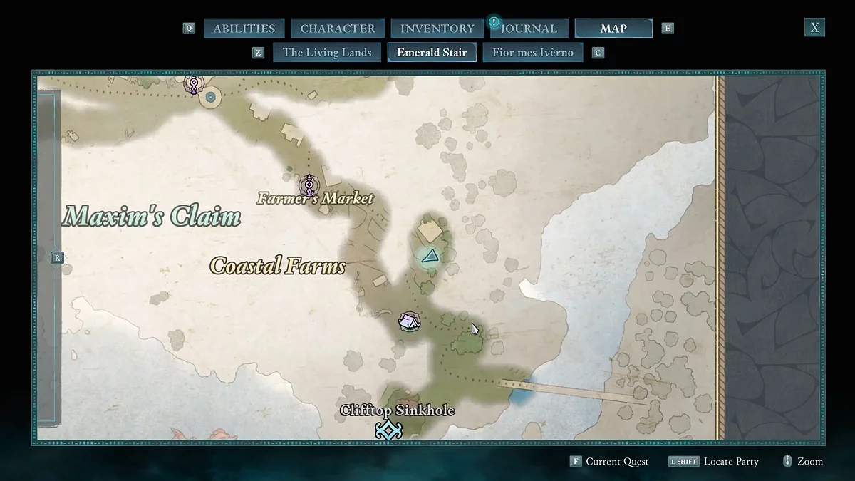 Таким образом мы попадём на открытую местность, находящуюся неподалёку от моста между Диколесьем и Фиор-Мес-Иверно. В этой же области вы можете обнаружить ещё один перевалочный пункт великолесья. Необходимо спуститься по уступам с одной из сторон с деревянными укреплениями, пока в конце концов не окажетесь рядом с сундуком художника на выступе.