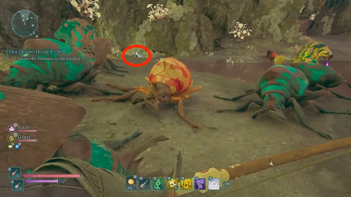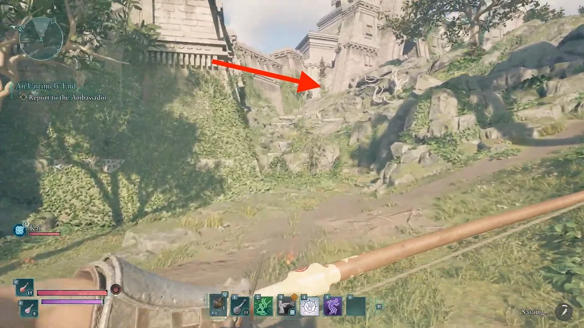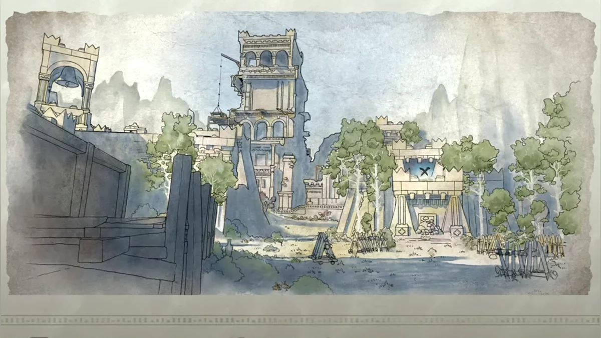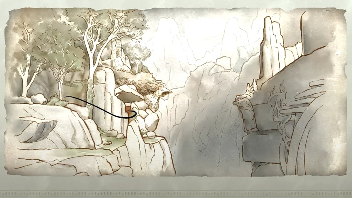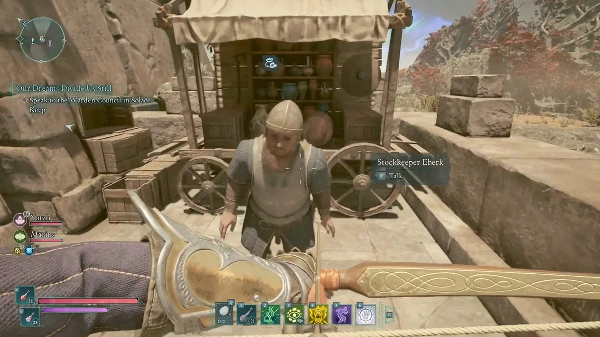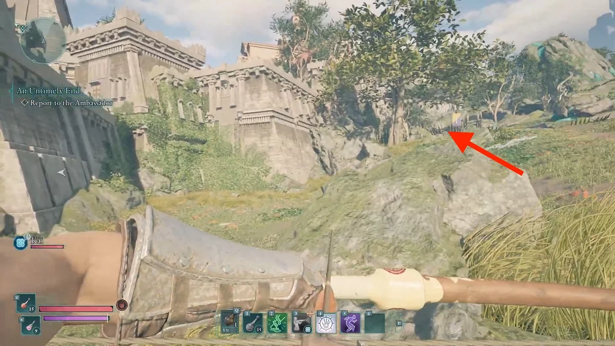 Таким образом мы попадём на открытую местность, находящуюся неподалёку от моста между Диколесьем и Фиор-Мес-Иверно. В этой же области вы можете обнаружить ещё один перевалочный пункт великолесья. Необходимо спуститься по уступам с одной из сторон с деревянными укреплениями, пока в конце концов не окажетесь рядом с сундуком художника на выступе.