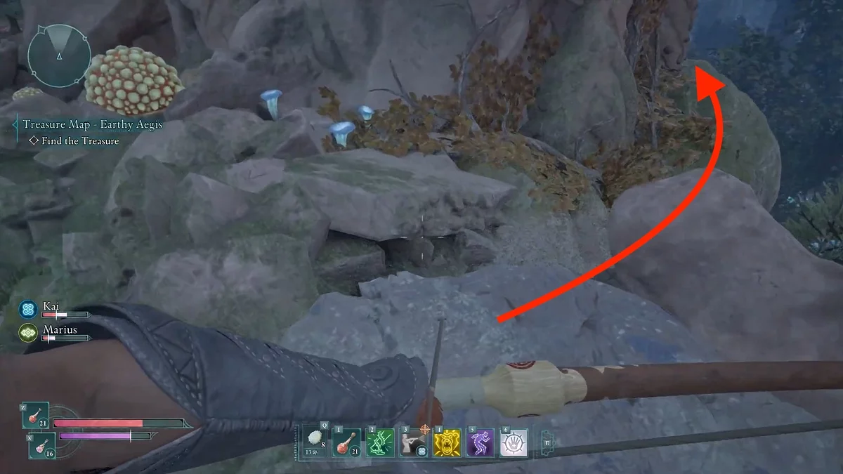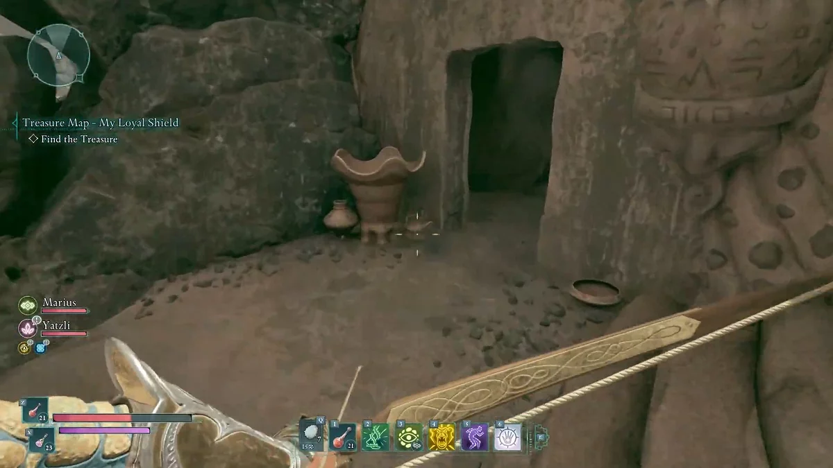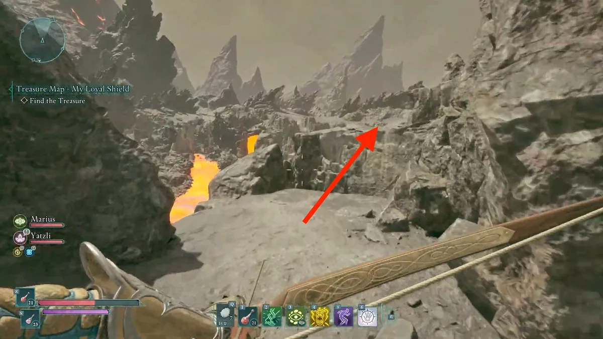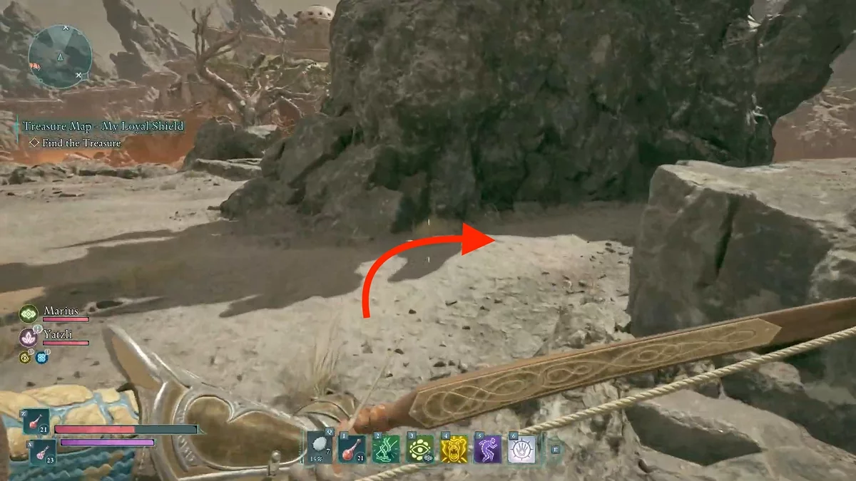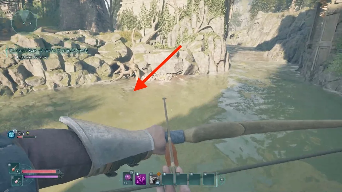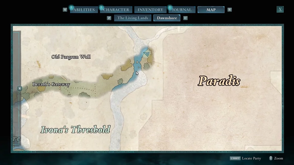 Загаданное место находится гораздо севернее: между заросшим приграничьем и порогом Ивоны, к западу от Парадиза. Пройдя вдоль реки до большой арки, нырнем в воду и свернем налево к большим корням. В конце тоннеля будет лежать награда: щит «Ветер и волна» и сундук.