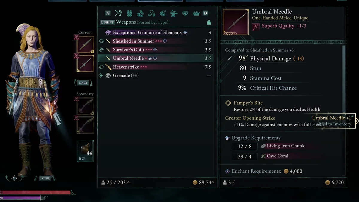 Достаточно сильный кинжал с повышенным шансом активации критического урона. Также обладает способностями небольшого вампиризма и возможностью забрать у противника на 15% больше здоровья, если он пока не потерял ни одного соответствующего очка.