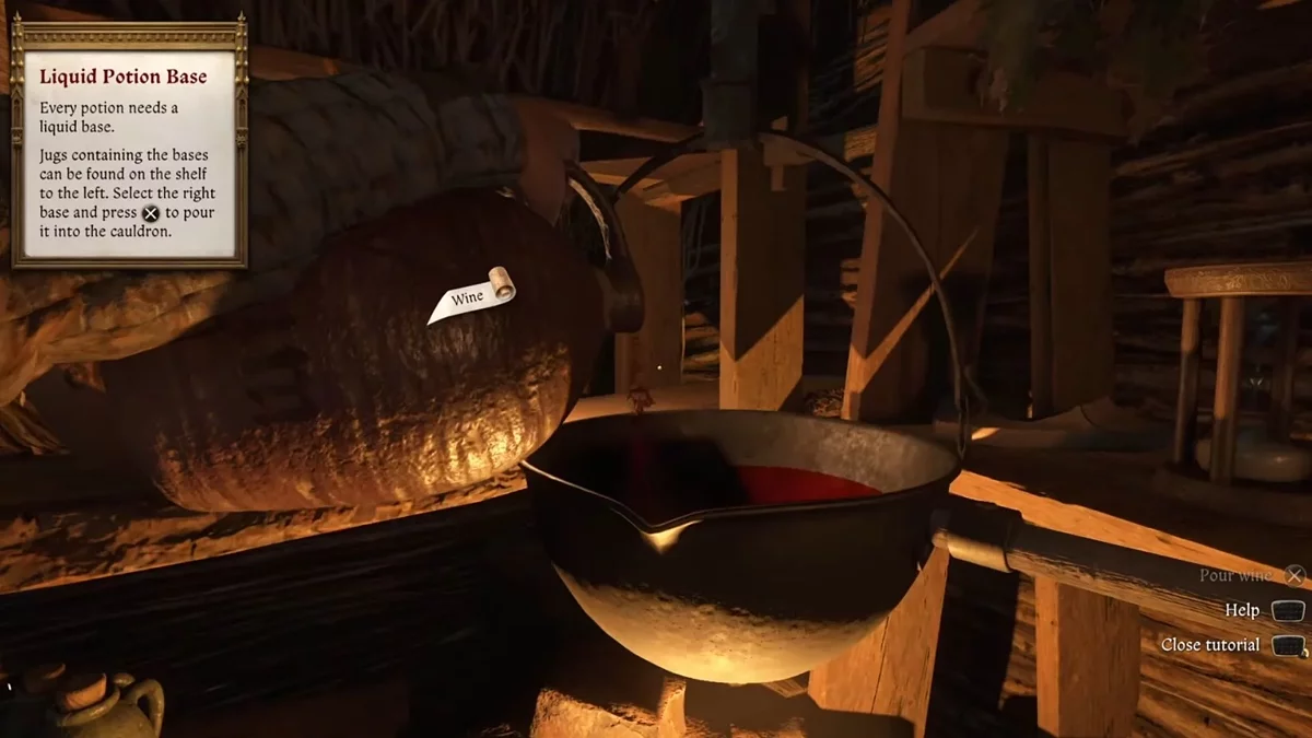Итак, вы все нашли и полностью готовы. Генри стоит около алхимического стола. Во-первых, откройте книгу рецептов и посмотрите, какие ингредиенты вам нужны. Если они в наличии, мешочки с травами все равно придется выложить на полку справа вручную. Основа стоит слева. Сразу же залейте вино, воду или масло в котел. Далее следуйте рецепту и добавляйте нужное количество горстей. Иногда травы необходимо измельчить. Для этого подойдет ступка внизу. Если в рецепте написано измельчить, но вы этого не сделали — отвар либо не получится вовсе, либо будет низшего качества.