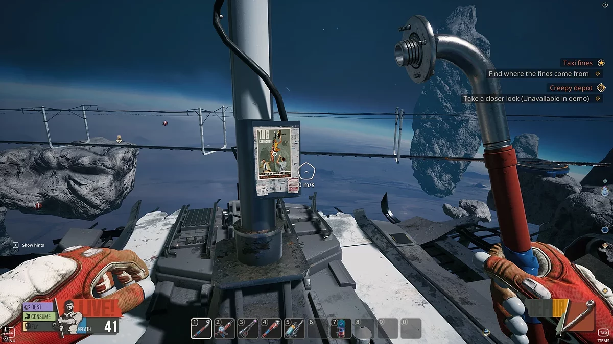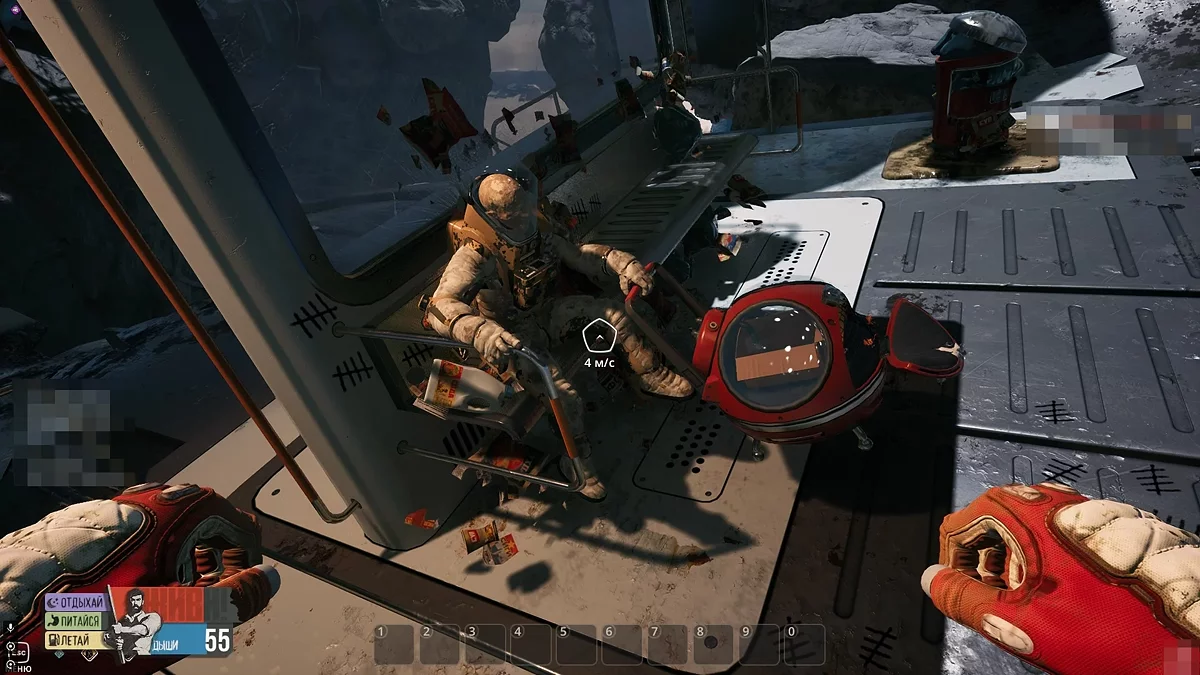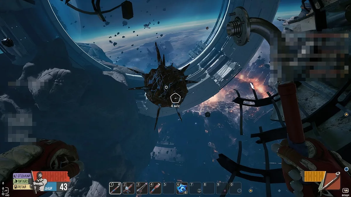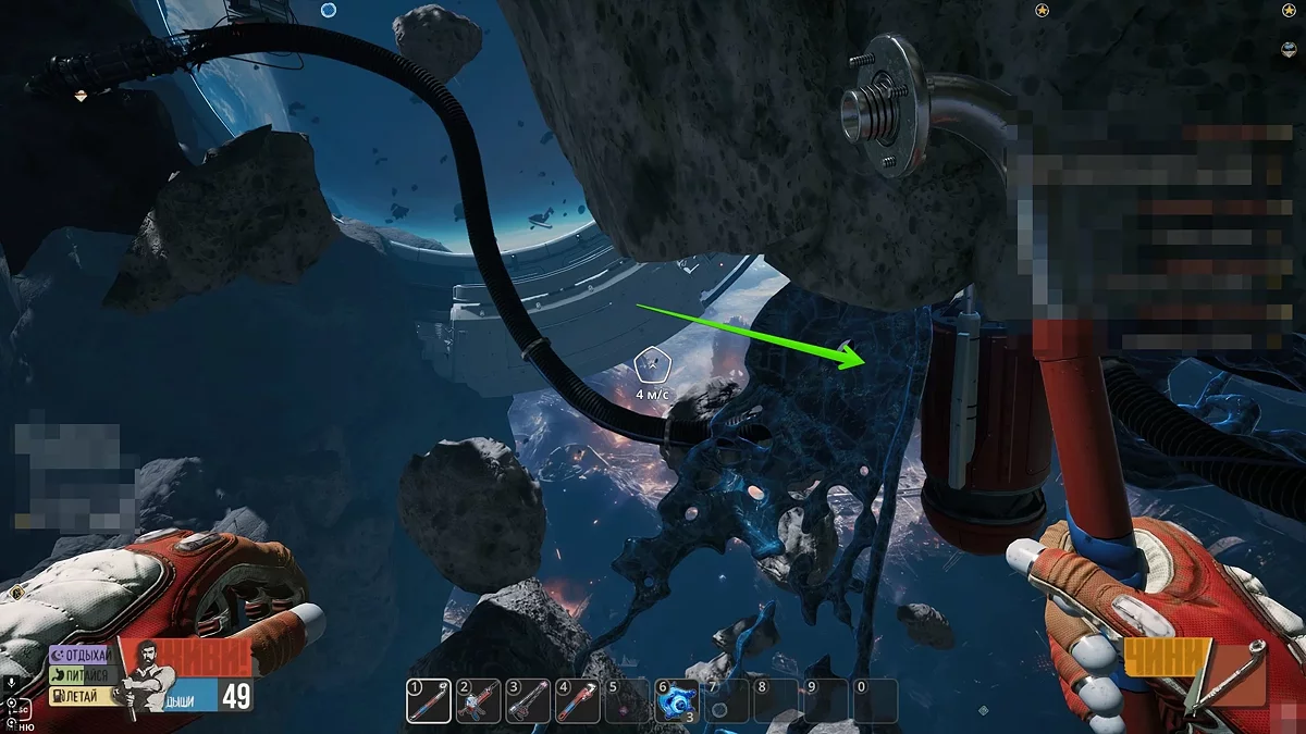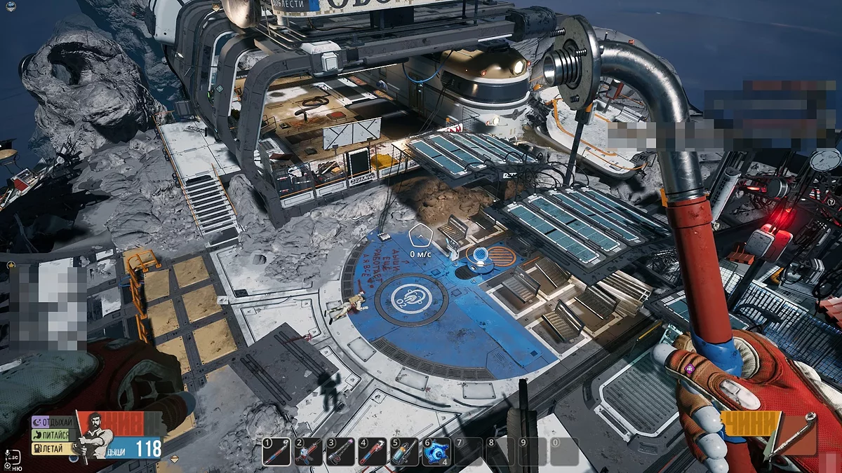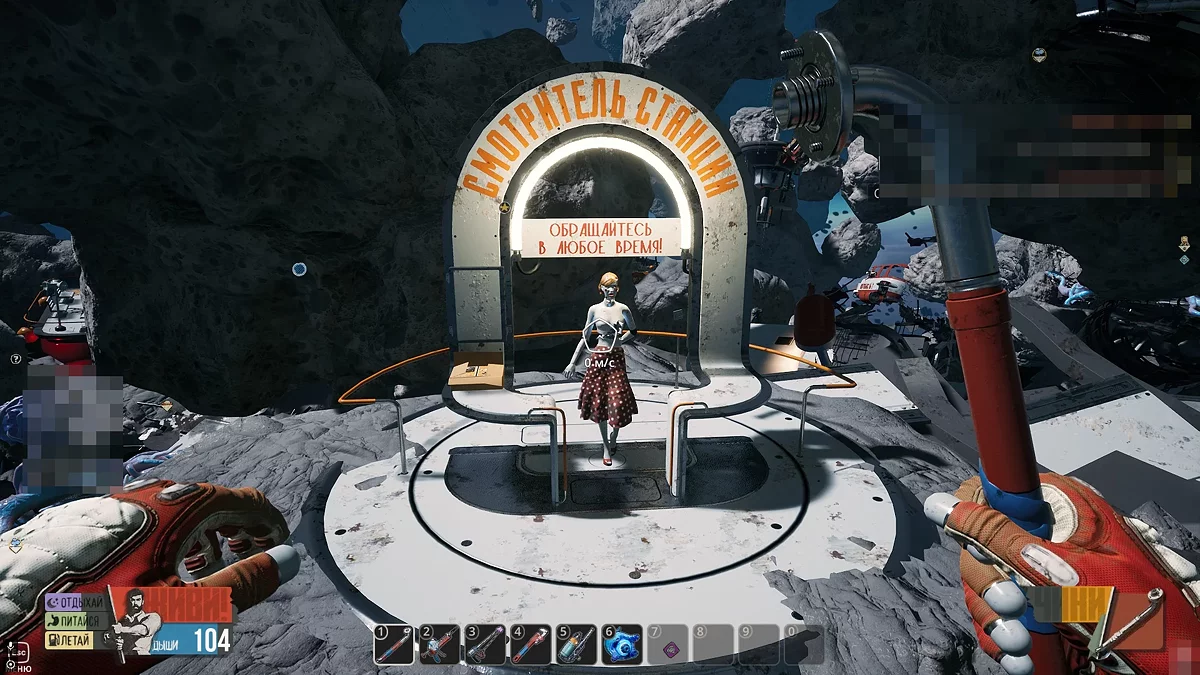 На некоторых объектах вы обнаружите платформы синего цвета, которые сигнализируют о наличии воздушных станций. Первый подобный прибор находится рядом с Деткой, неподалёку от входа в вагон поезда. Немного позже вы сможете обнаружить кислородные потоки в астероидах, куда можно устанавливать собственные воздушные станции, собранные в инвентаре.