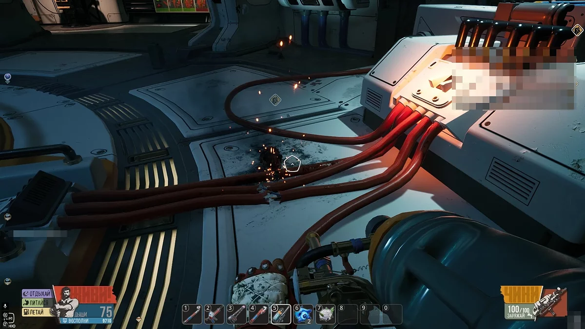 Осмотрев этот объект, сперва сломайте металлические стержни на двери, затем изучите поломки слева и справа от неё. Для ремонта щитка потребуется 10 единиц алюминия, а для разрыва соединения проводов нужно найти 15 единиц титана. Последняя задача немного сложнее, так как в открытом космосе титана довольно мало.