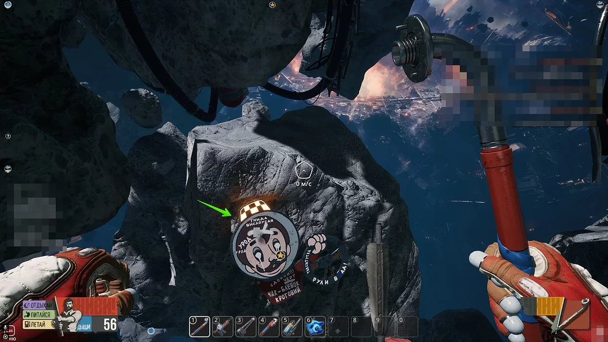 Отправляйтесь к астероиду с большими часами и гермодверью. Справа от двери соедините две контактные пластины, чтобы войти внутрь. Обыщите труп слева от входа в основной отсек, чтобы получить чертеж оружия Брызготрон. Соберите его в инвентаре — так будет проще выполнить следующее задание.