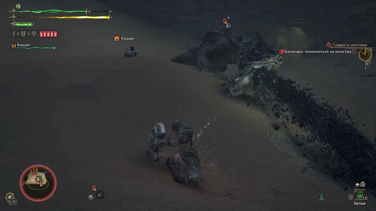 Если гигант скроется под песком, используйте звуковые бомбы, чтобы вынудить его появиться на поверхности. После победы вы сможете собрать материалы для создания мощного водного оружия, а также брони и талисманов, которые обеспечат защиту от замедления и водных атак.