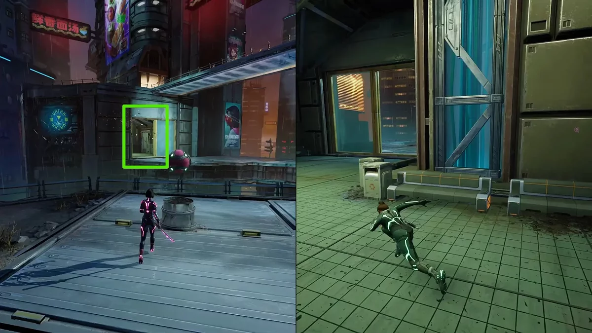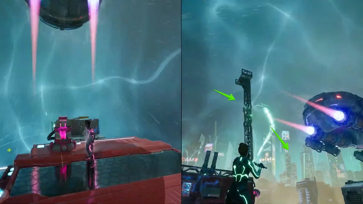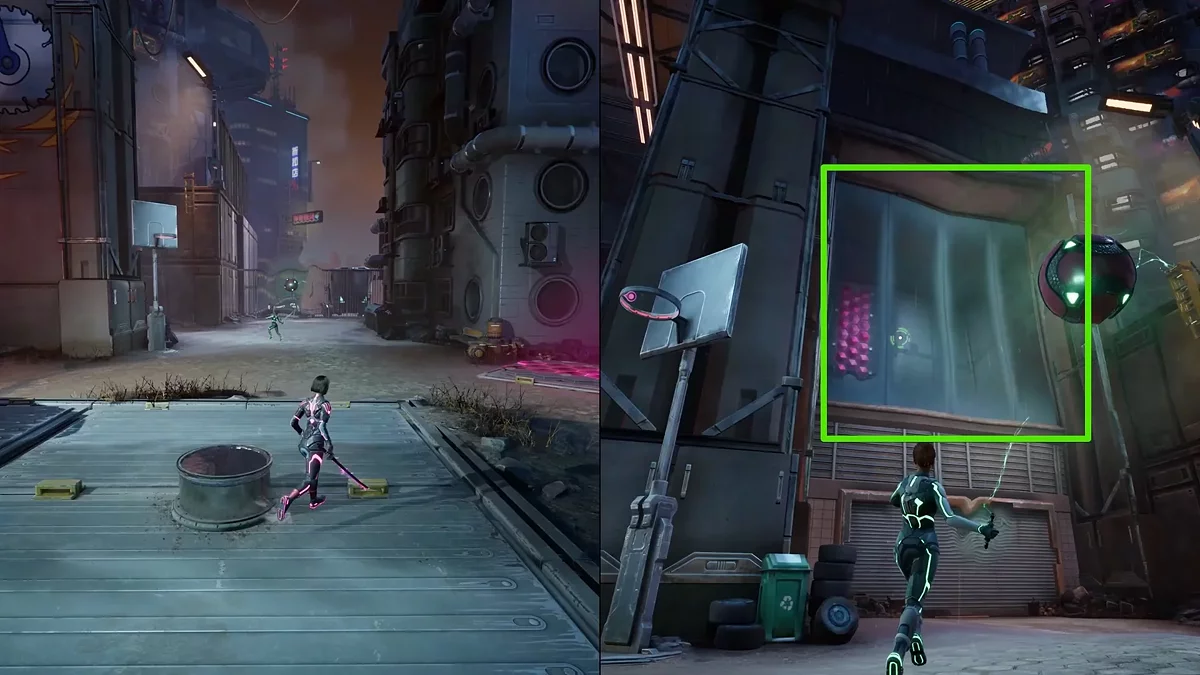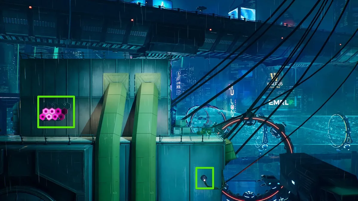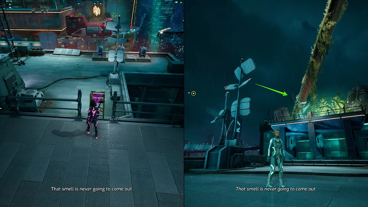 Дальше предстоит немного паркура до крыши одного из зданий. Здесь поднимите энергетический элемент — приятель разобьёт его и остановит вращение вентилятора. Так вы сможете проникнуть в ночной клуб. Касаться пола нельзя: используйте места для зацепа и металлические площадки. В конце уровня садитесь в лифт и смотрите катсцену, после которой придётся сразиться с боссом.