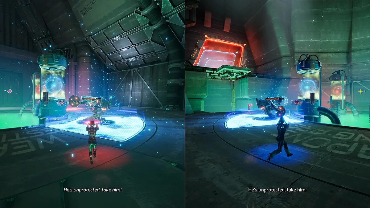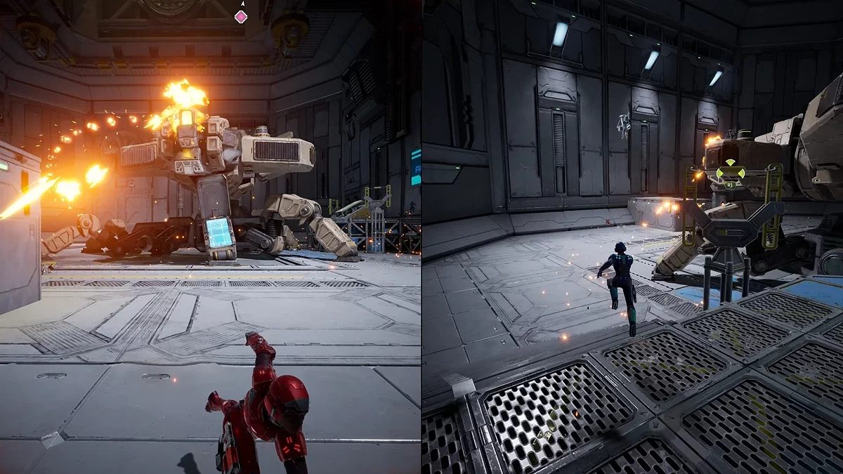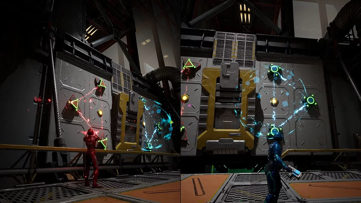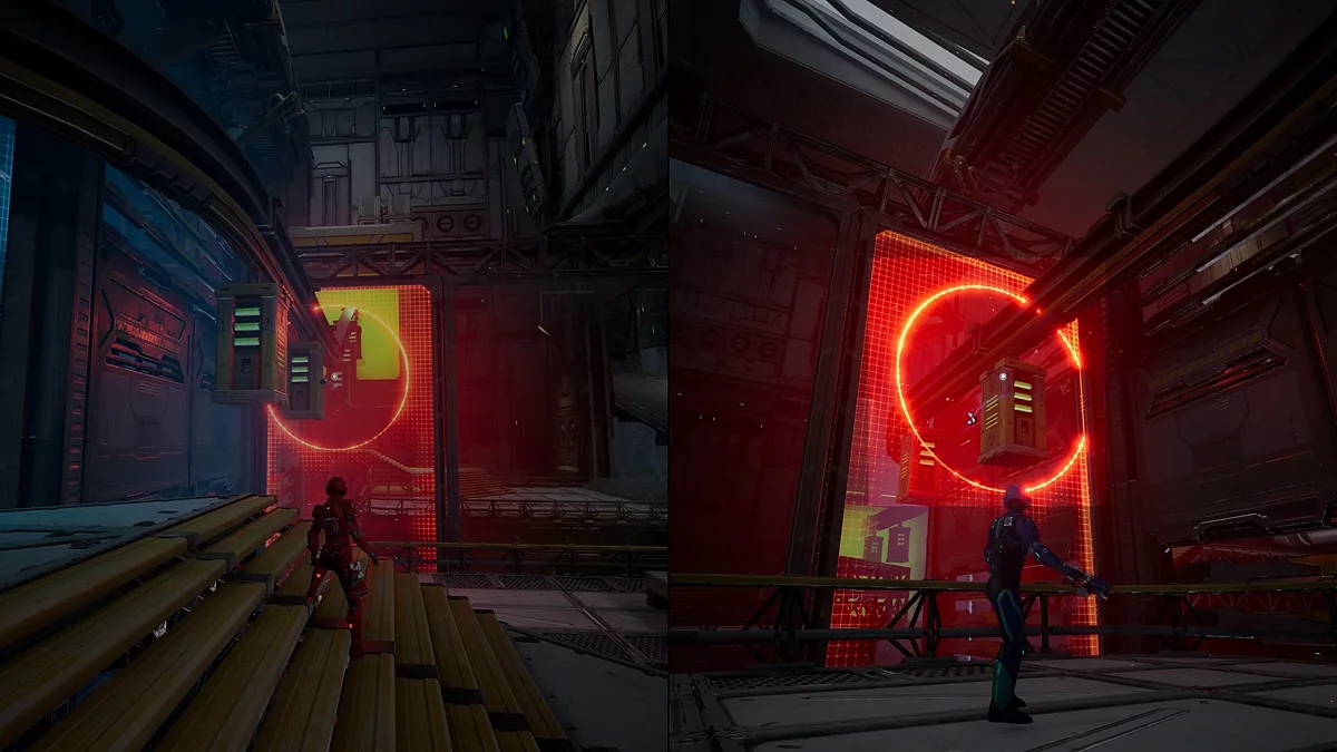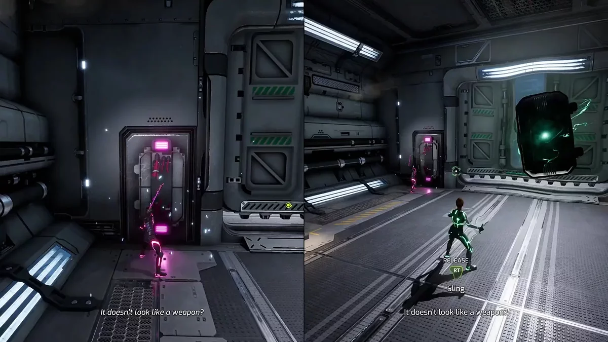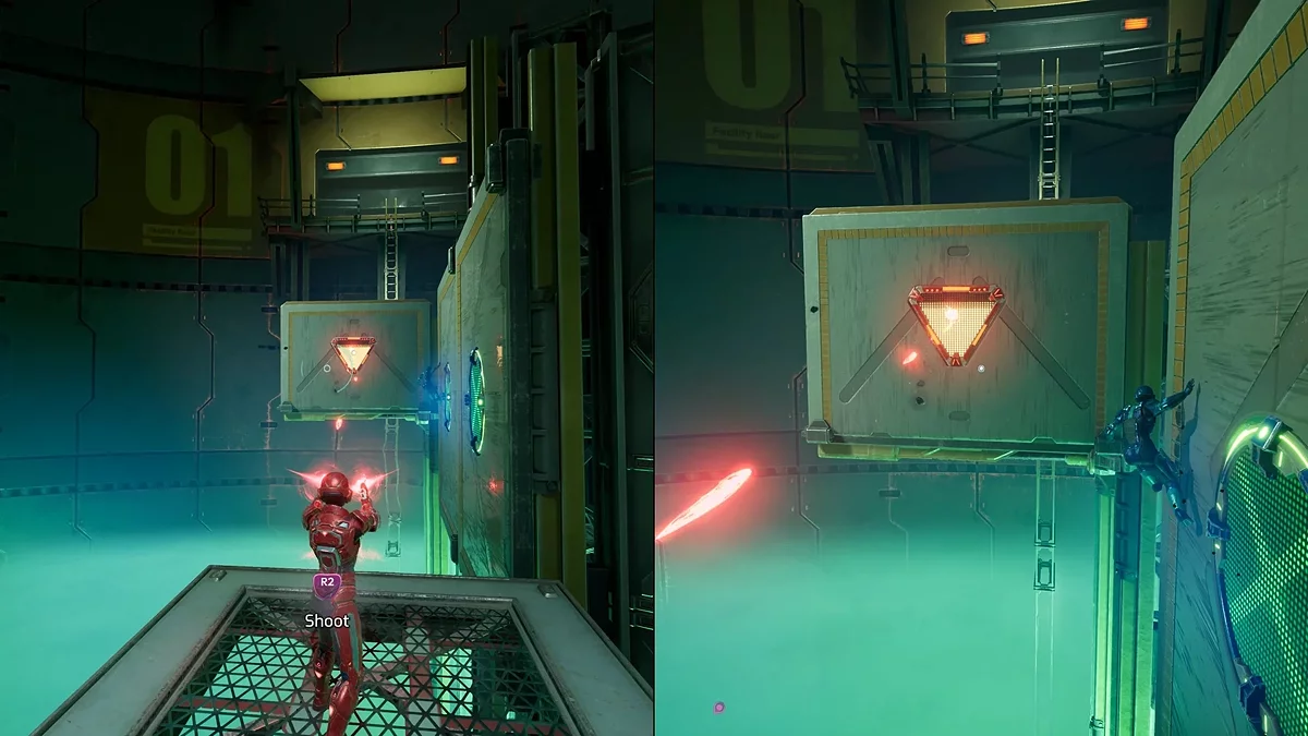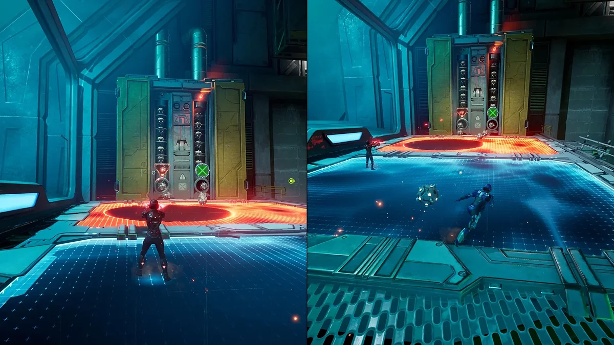 После продолжительной катсцены у героев появятся новые девайсы: игрок справа сможет поднимать предметы, а геймер слева использовать оружие ближнего боя для открытия дверей и взаимодействия с другими механизмами. Например, в самом начале локации сорвите крышку с энергомодуля на воротах и атакуйте его, чтобы товарищ мог поднять их и открыть проход.