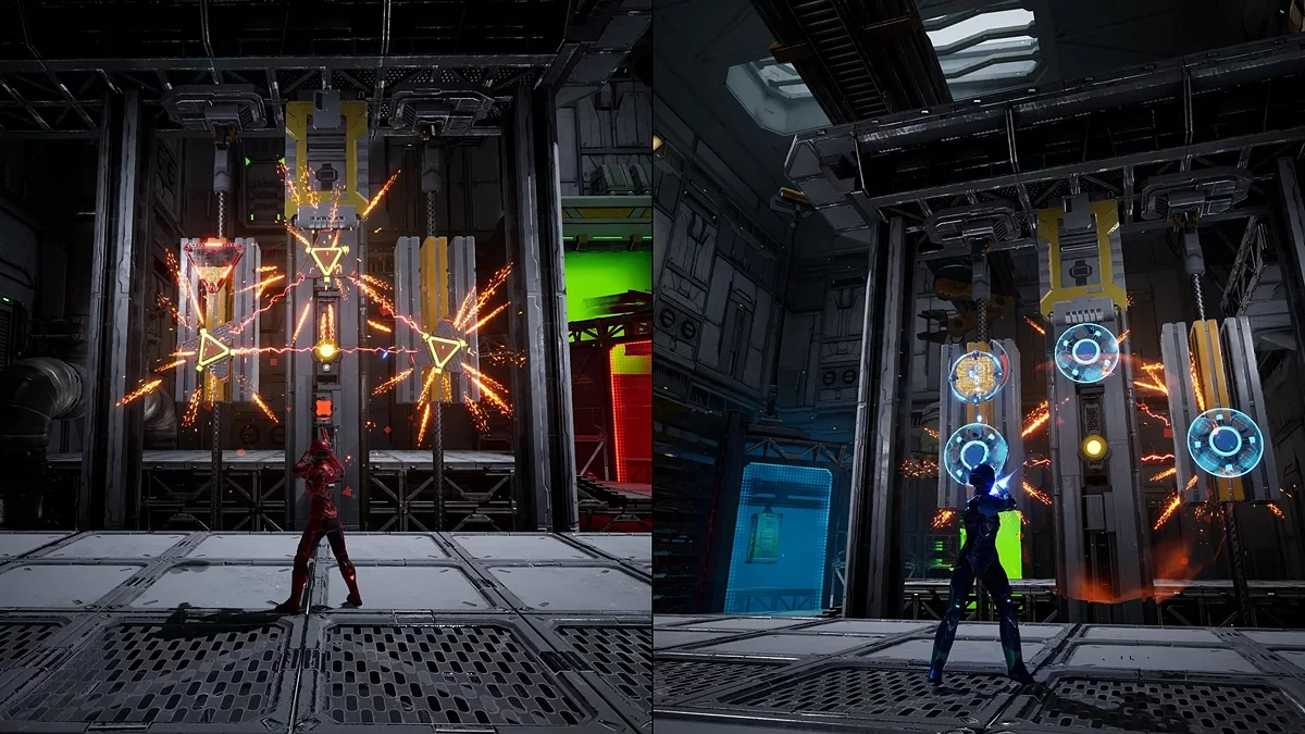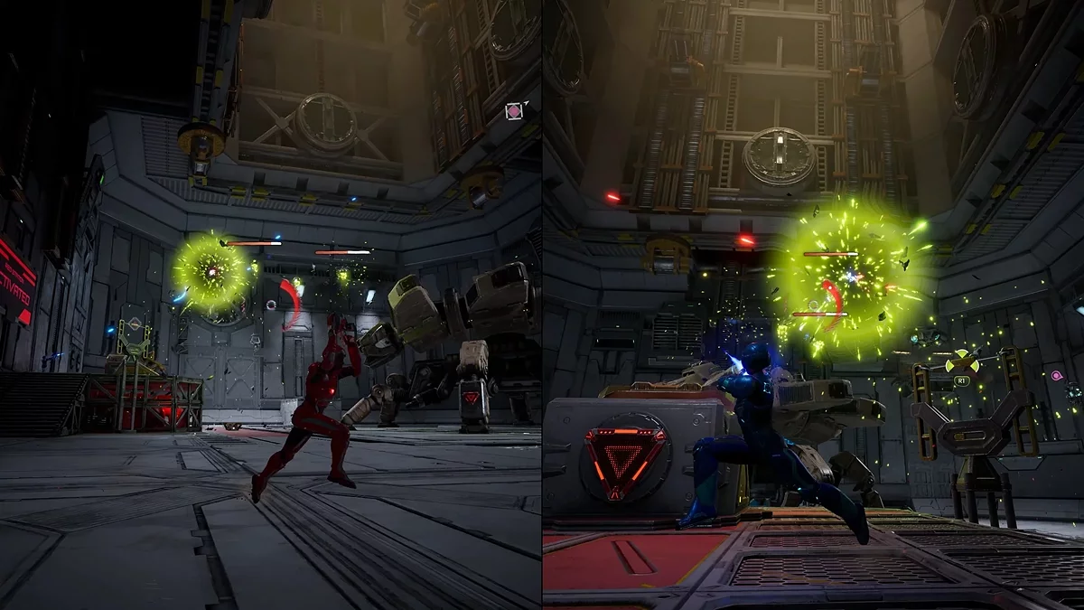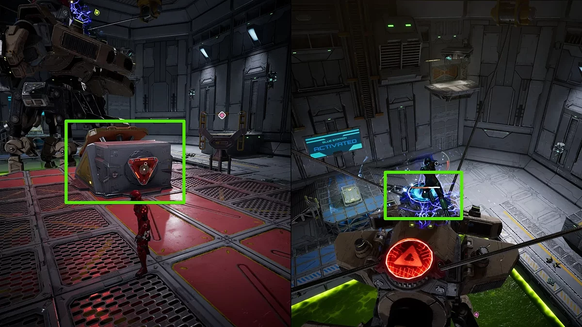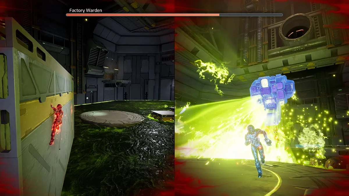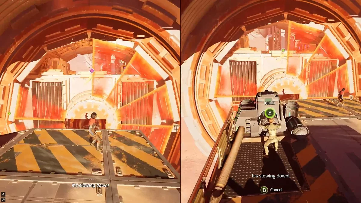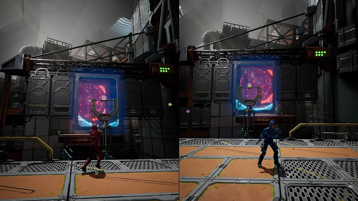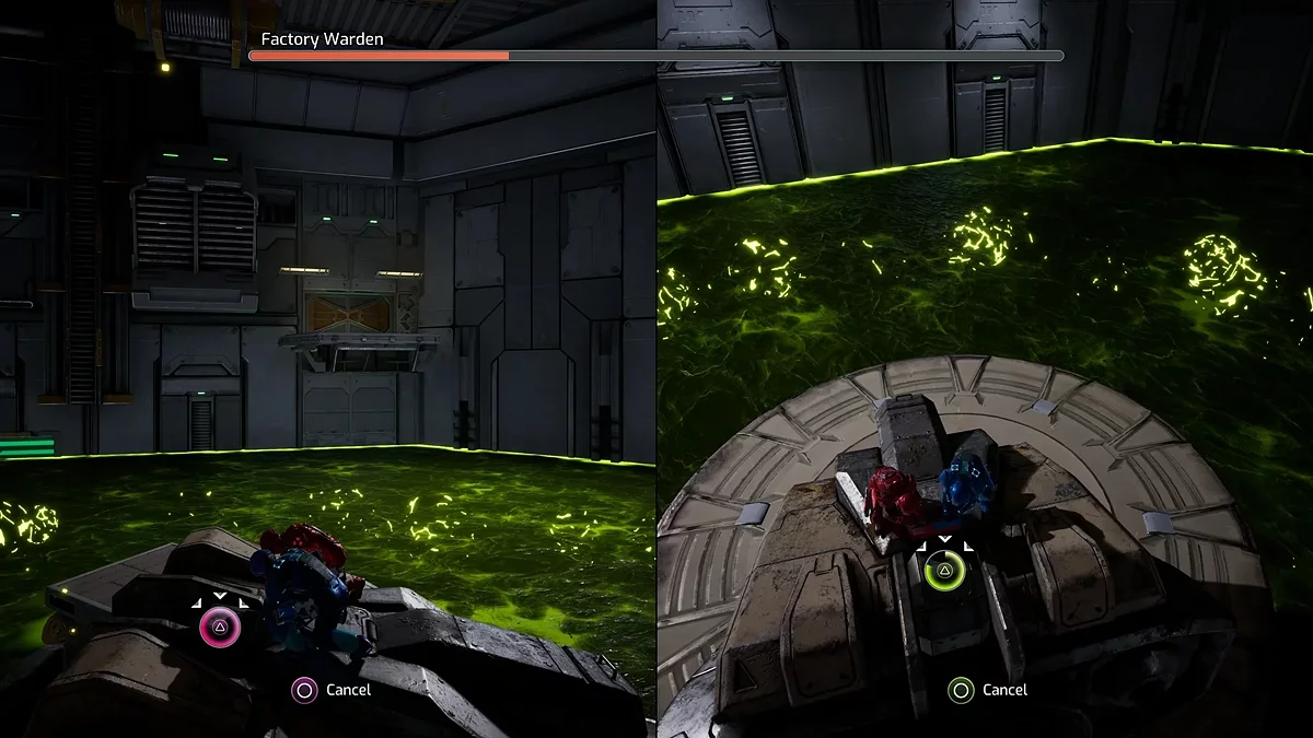 После продолжительной катсцены у героев появятся новые девайсы: игрок справа сможет поднимать предметы, а геймер слева использовать оружие ближнего боя для открытия дверей и взаимодействия с другими механизмами. Например, в самом начале локации сорвите крышку с энергомодуля на воротах и атакуйте его, чтобы товарищ мог поднять их и открыть проход.
