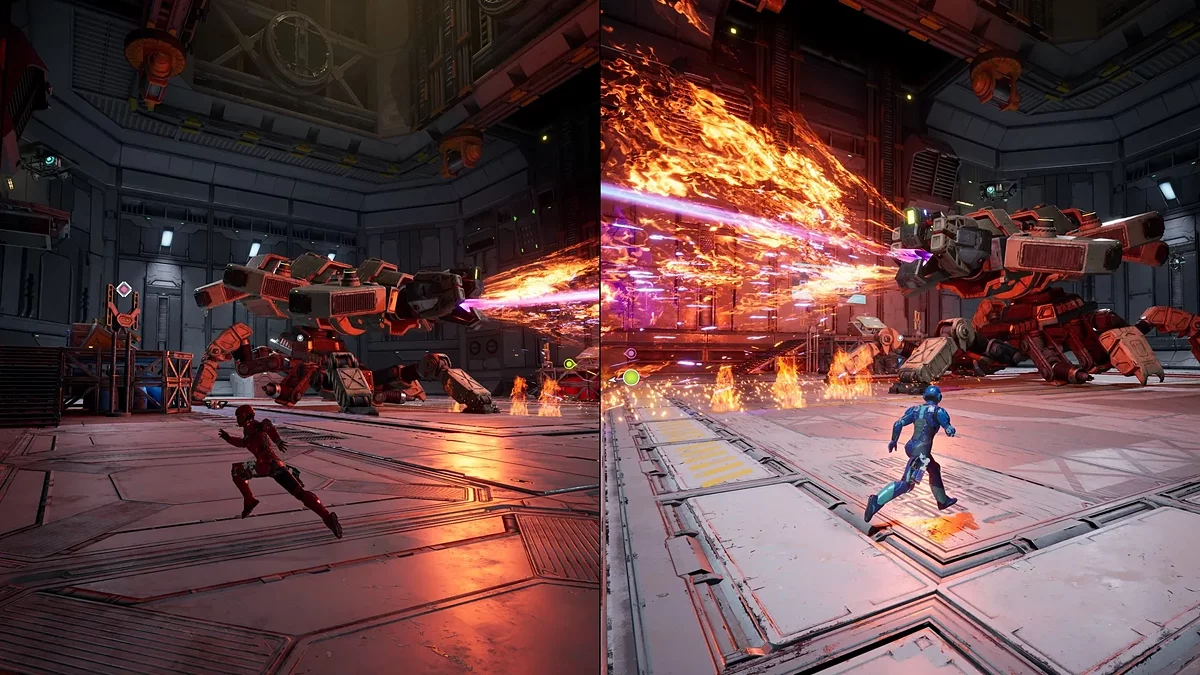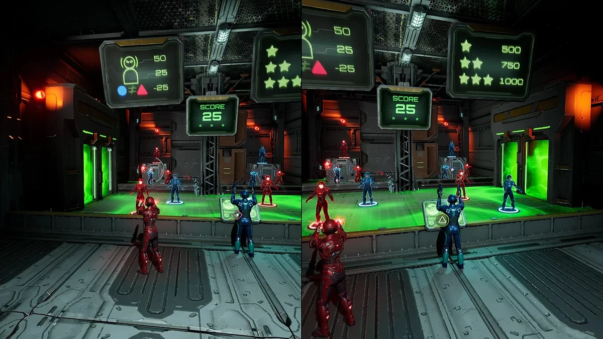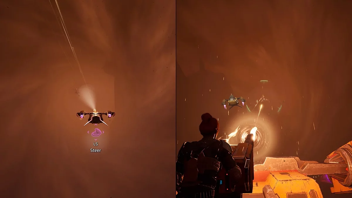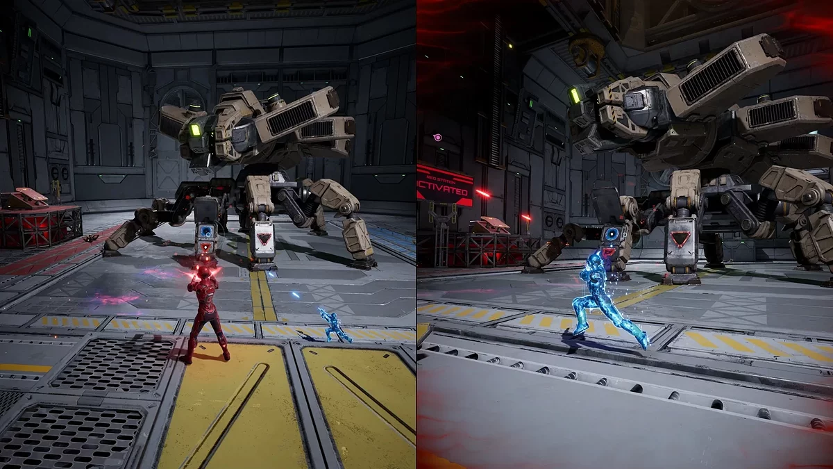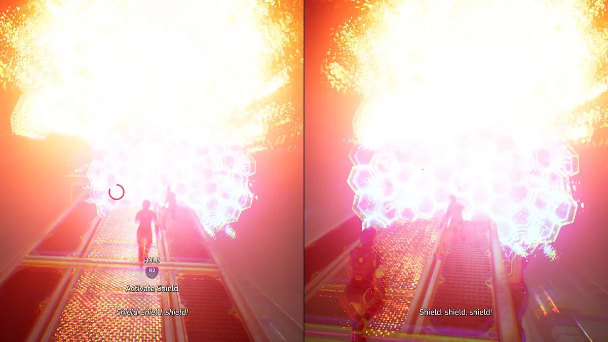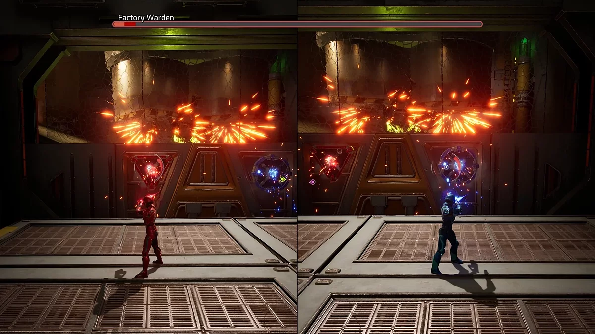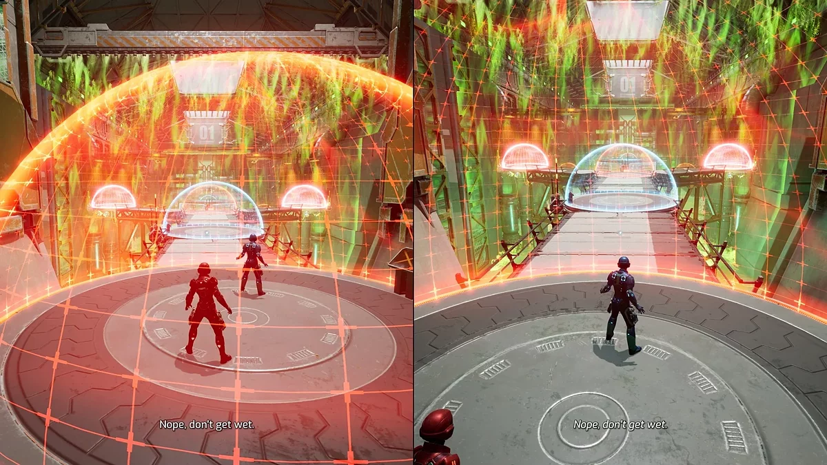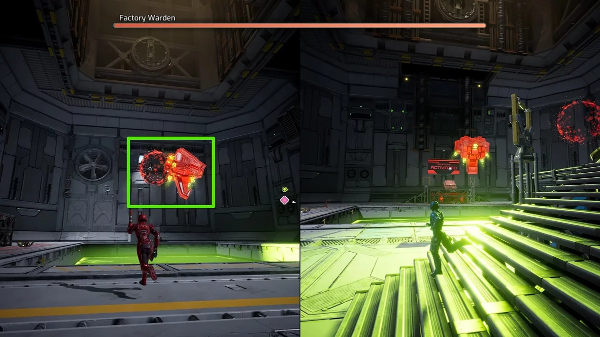 После продолжительной катсцены у героев появятся новые девайсы: игрок справа сможет поднимать предметы, а геймер слева использовать оружие ближнего боя для открытия дверей и взаимодействия с другими механизмами. Например, в самом начале локации сорвите крышку с энергомодуля на воротах и атакуйте его, чтобы товарищ мог поднять их и открыть проход.