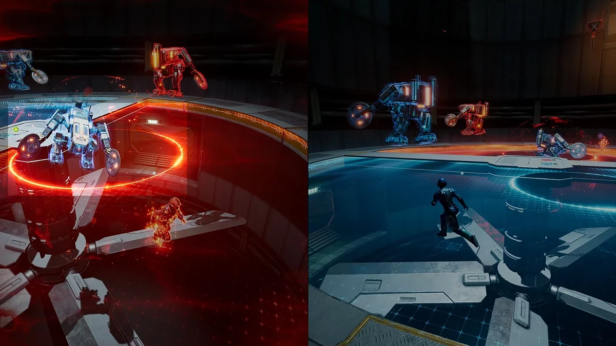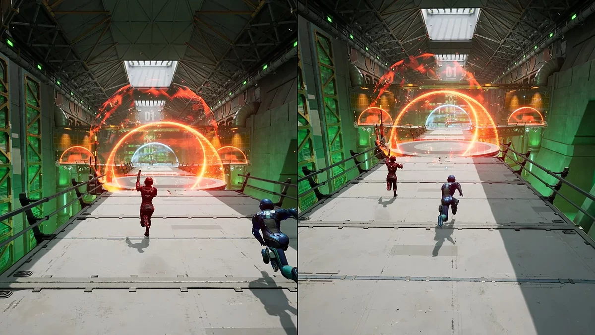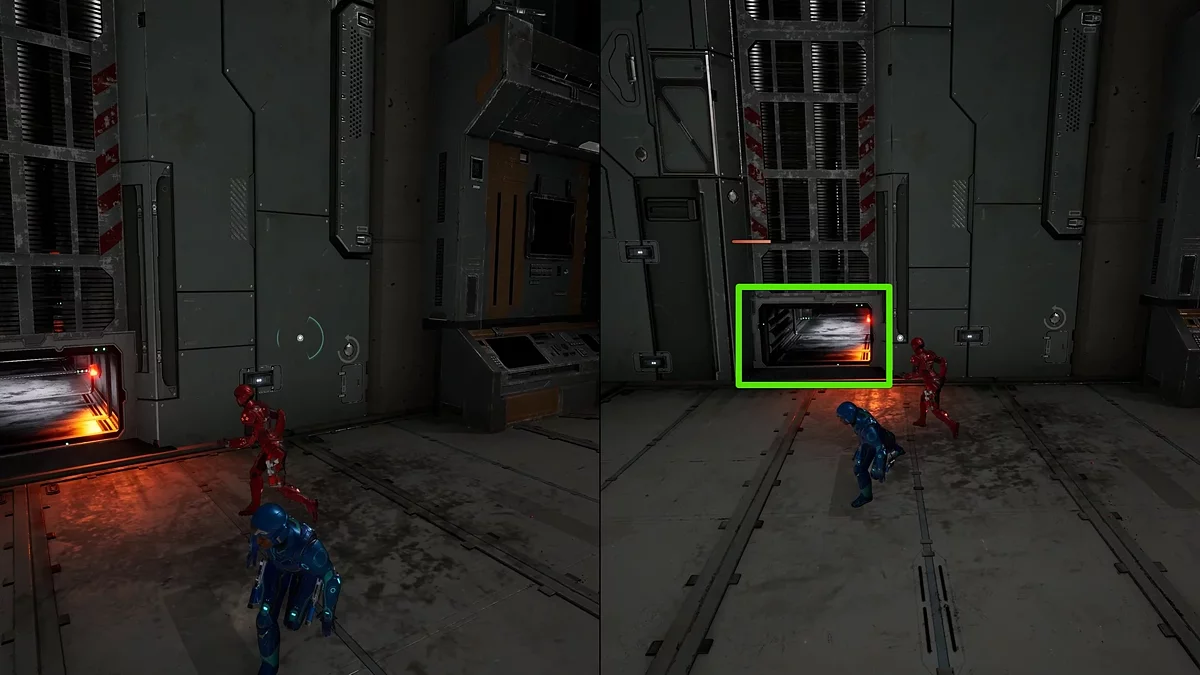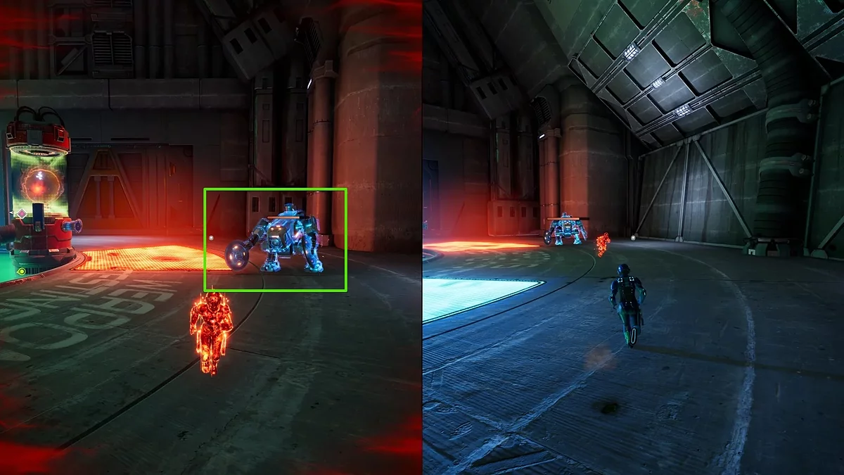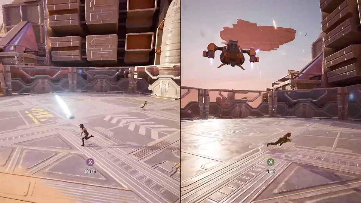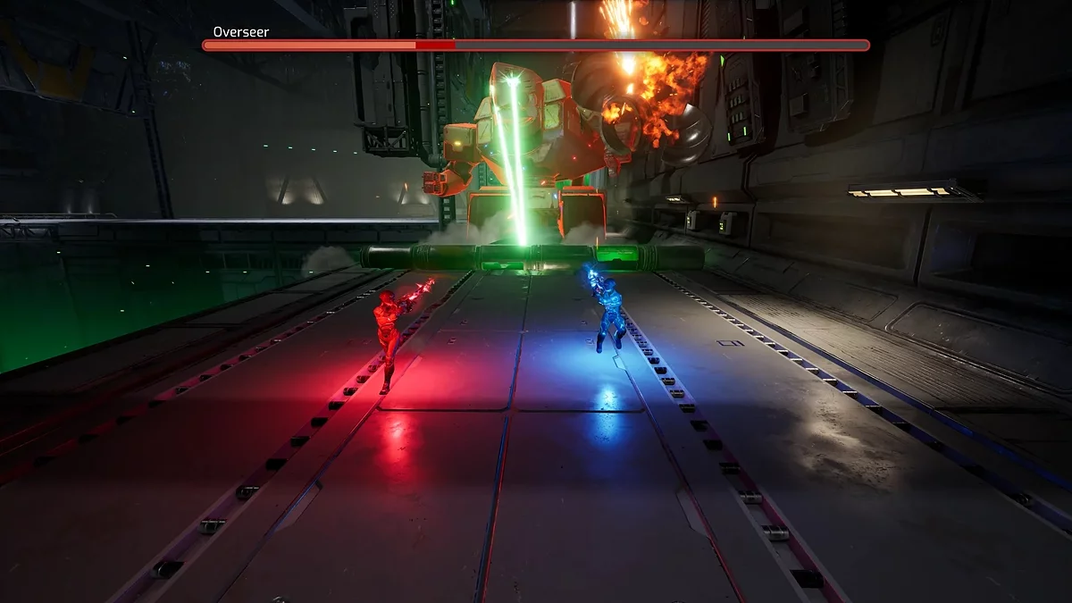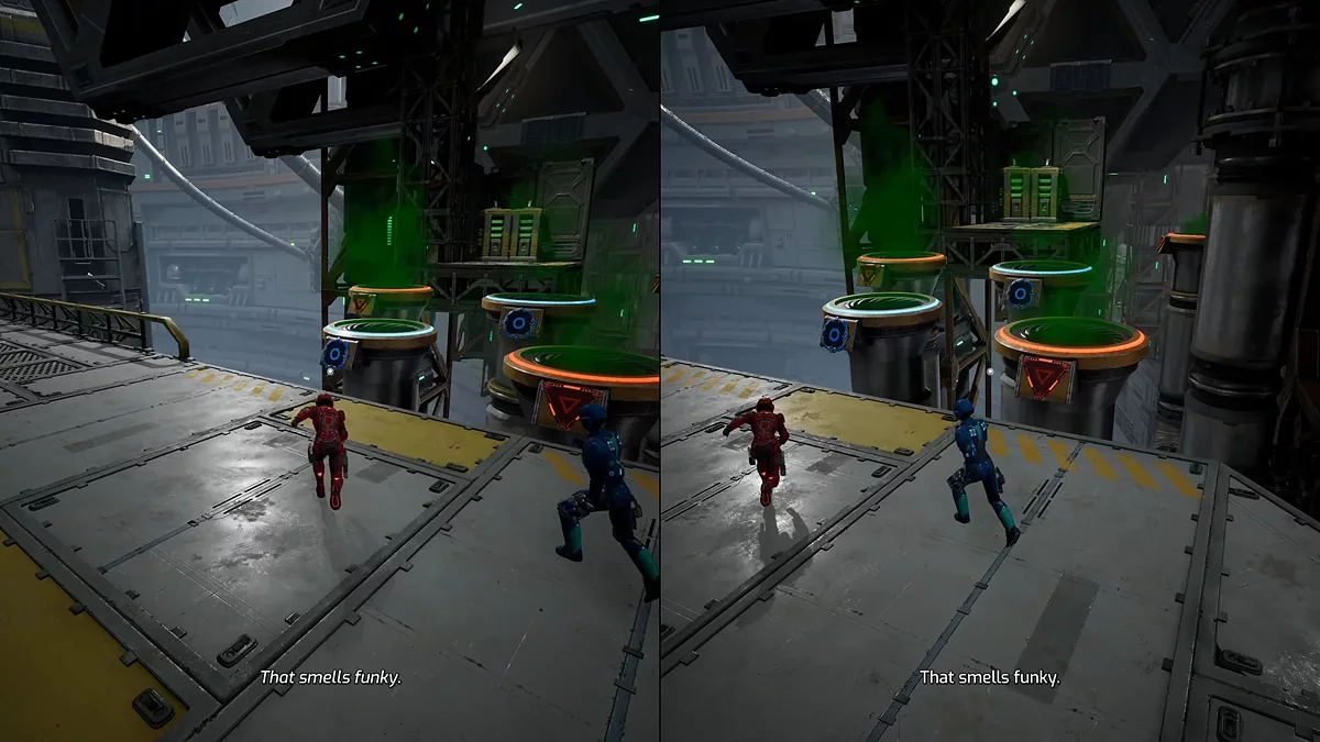 После продолжительной катсцены у героев появятся новые девайсы: игрок справа сможет поднимать предметы, а геймер слева использовать оружие ближнего боя для открытия дверей и взаимодействия с другими механизмами. Например, в самом начале локации сорвите крышку с энергомодуля на воротах и атакуйте его, чтобы товарищ мог поднять их и открыть проход.