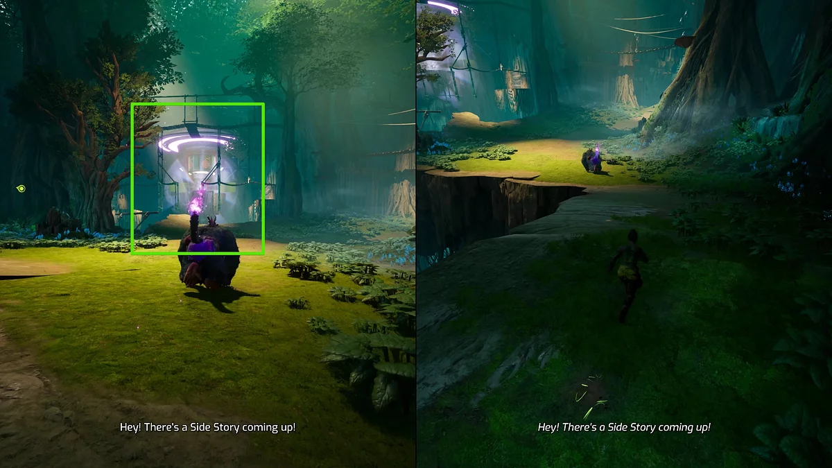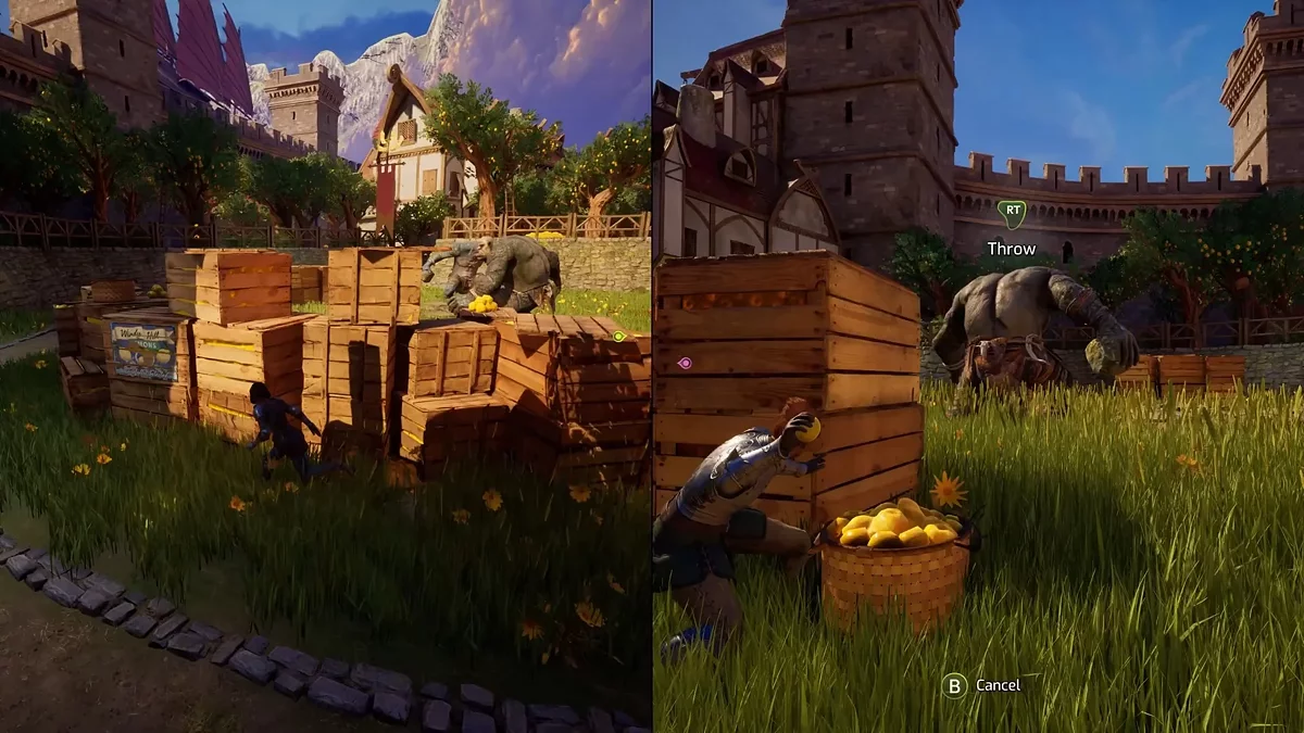 В следующей локации нужно разделиться: один игрок идет вправо и бросает в монстров фрукты для отвлечения, второй же пытается пробраться за укрытие слева. Сделав это, нужно поменяться ролями.