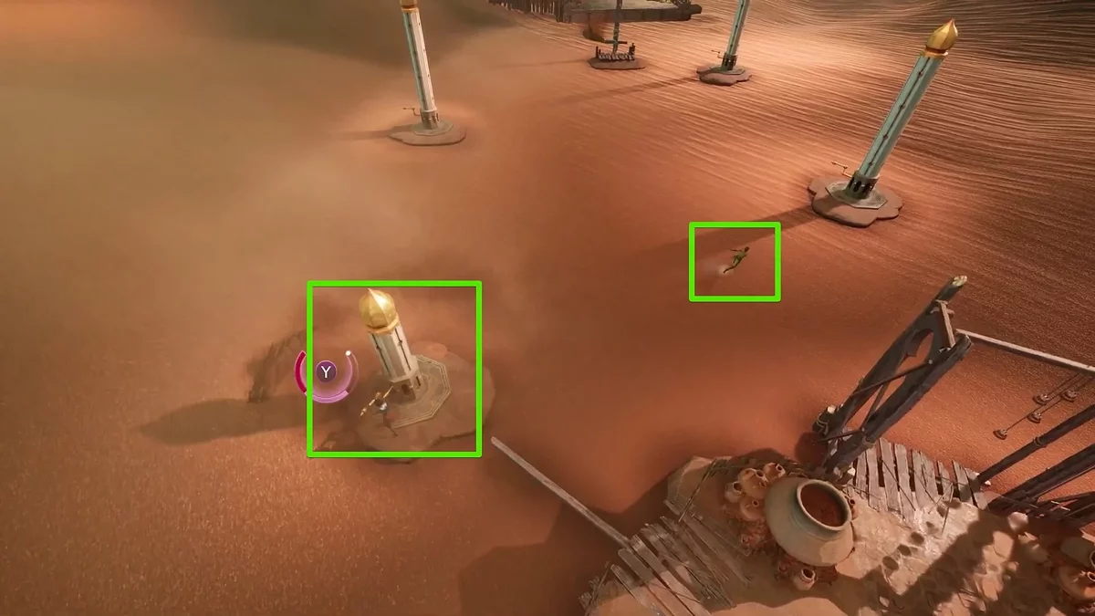 Добравшись до врат, откройте их и скользите вниз. Здесь важно избегать песков, поскольку в них затаился хищник. Вам по очереди нужно использовать башни для привлечения внимания противника, пока напарник перебирается к следующей колонне. Преодолейте следующее препятствие и бегите по канату вперёд, затем поднимайтесь по столбам и приготовьтесь скользить. Забирайтесь ещё выше и пройдите через башню, взаимодействовав с массивными воротами.