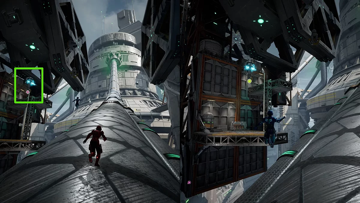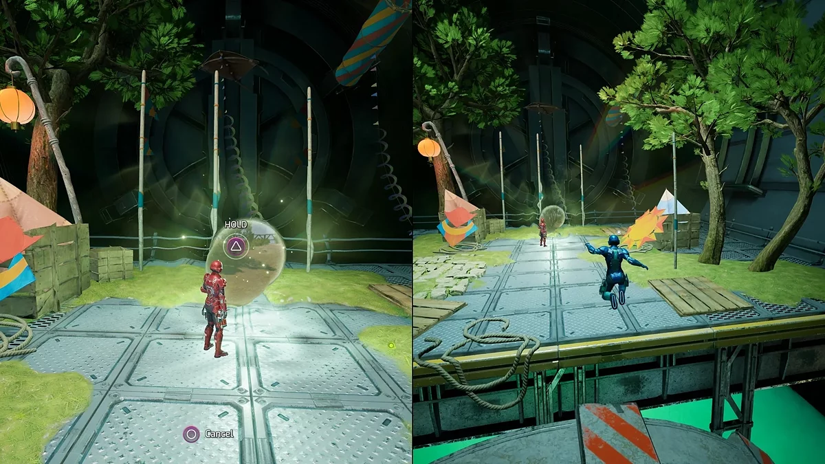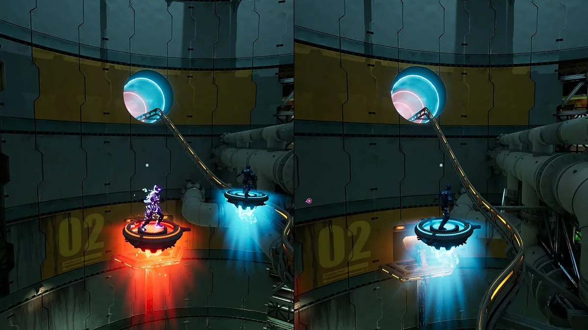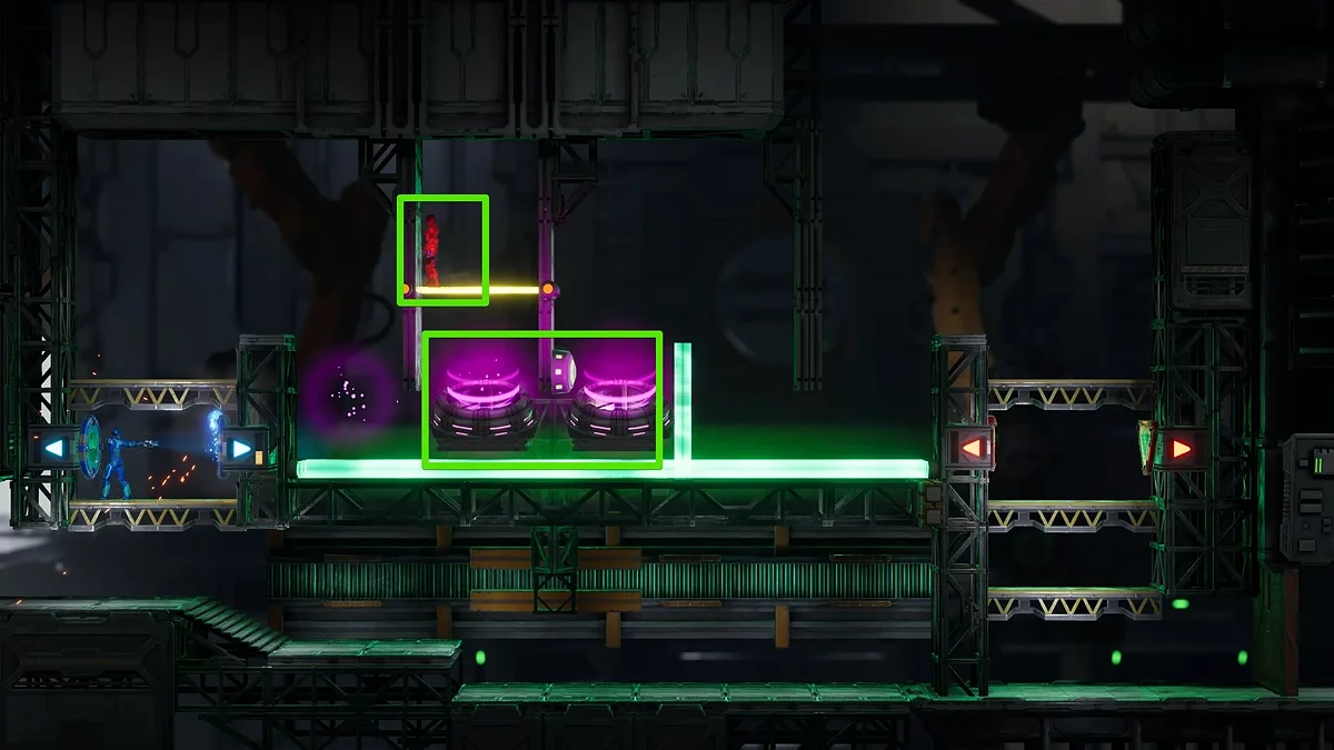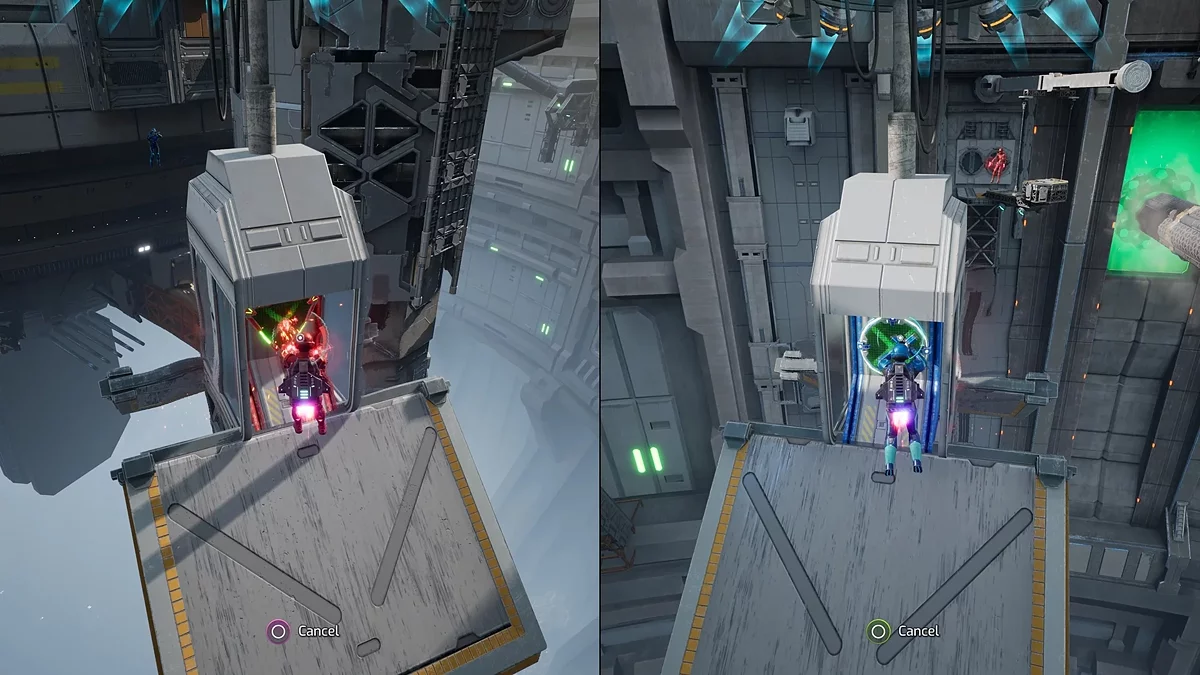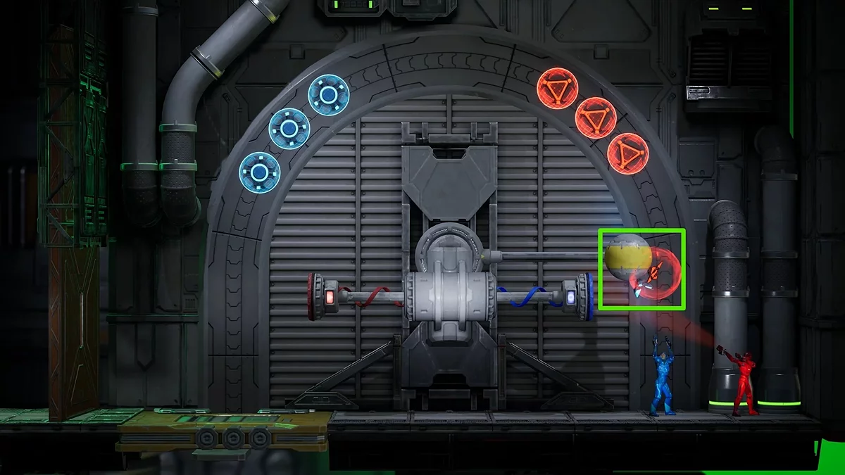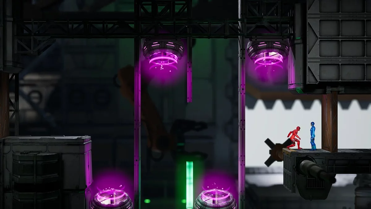 Вы окажетесь у обрыва. Игрок слева должен подтянуться к гравитационной платформе розового цвета и перерезать кабель, а второй персонаж использует его для преодоления препятствия. Так как первый игрок находится на стене, герой со способностью перемещать предметы подвигает к нему контейнер и перемещает его влево. Добравшись до края платформы, персонаж с оружием разбивает решётку, а второй игрок устраняет преграду в виде ящиков.