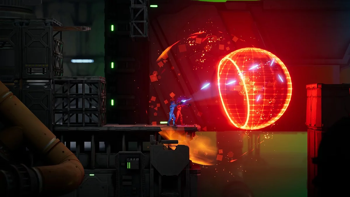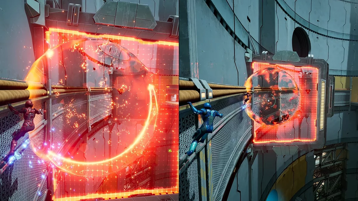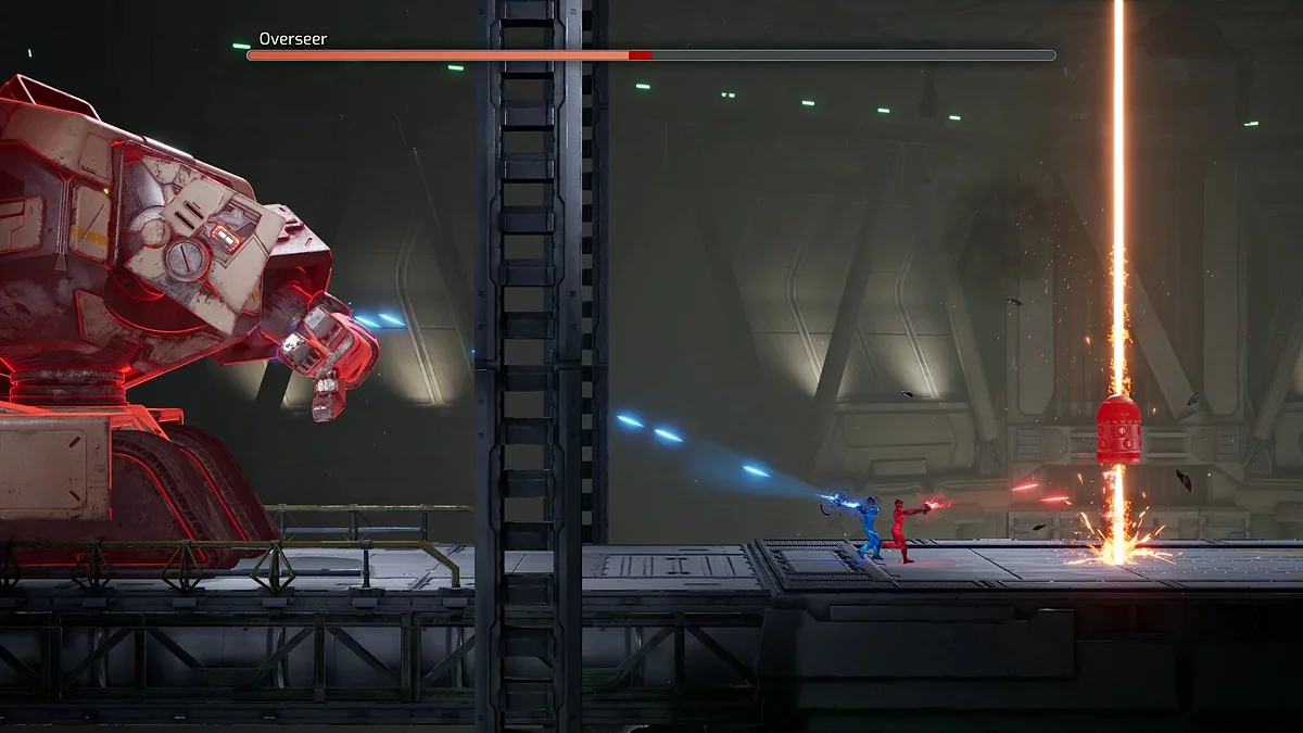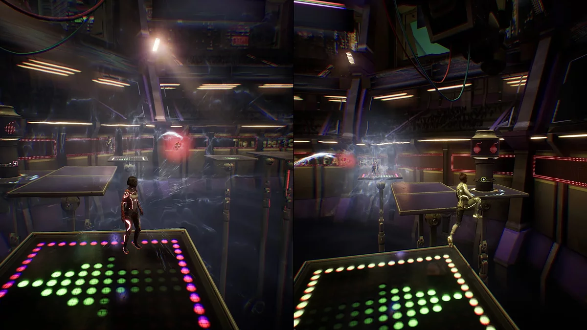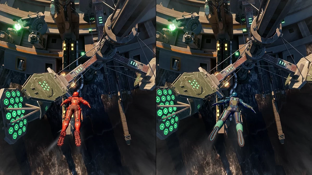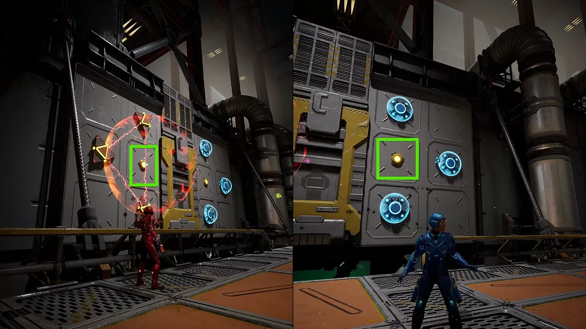 Вы окажетесь у обрыва. Игрок слева должен подтянуться к гравитационной платформе розового цвета и перерезать кабель, а второй персонаж использует его для преодоления препятствия. Так как первый игрок находится на стене, герой со способностью перемещать предметы подвигает к нему контейнер и перемещает его влево. Добравшись до края платформы, персонаж с оружием разбивает решётку, а второй игрок устраняет преграду в виде ящиков.