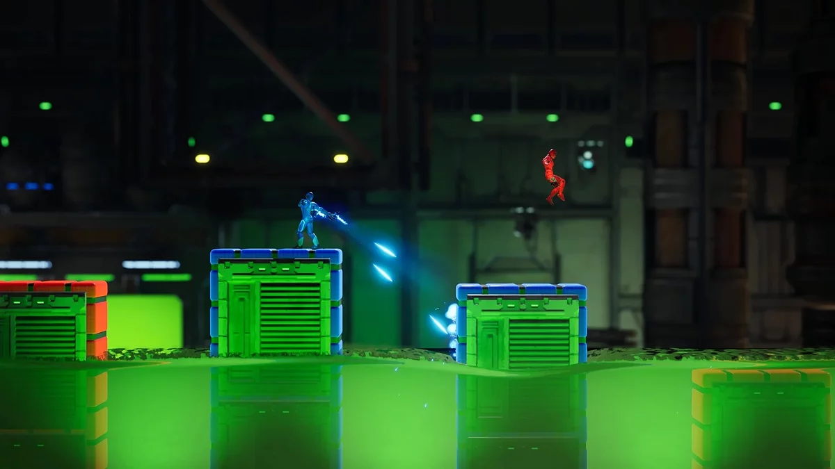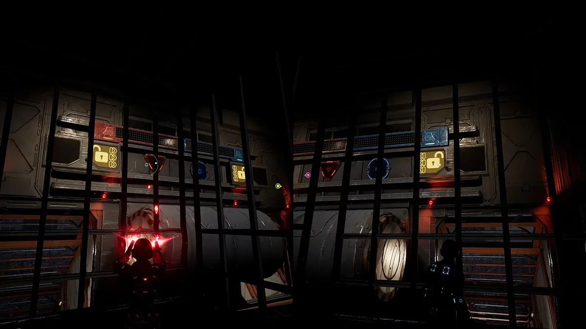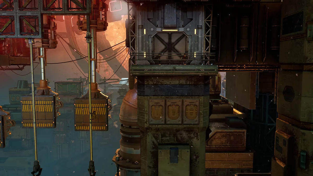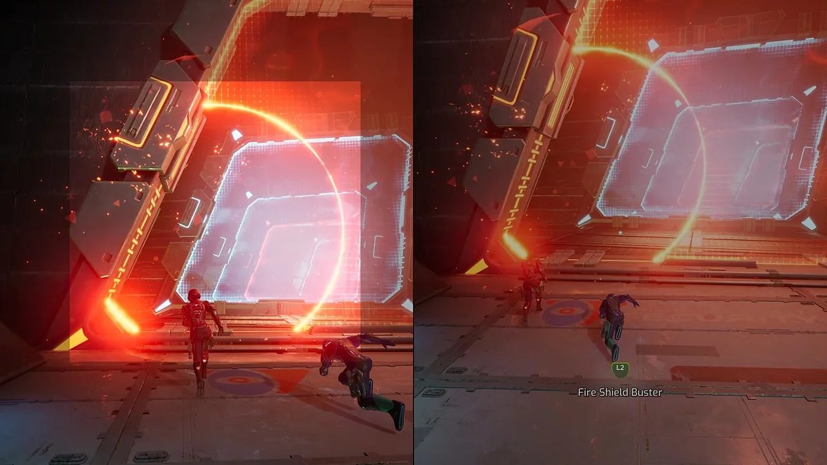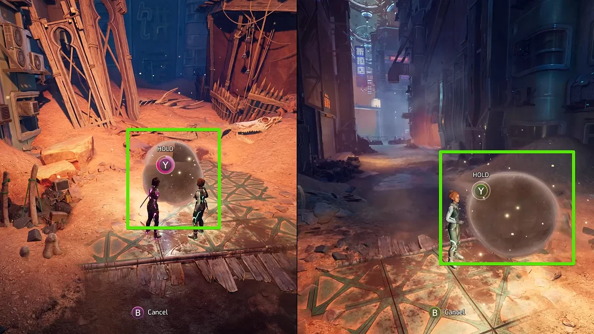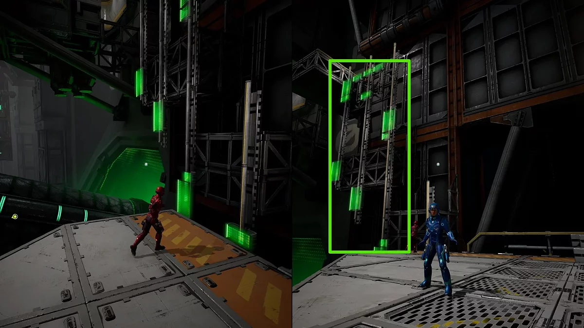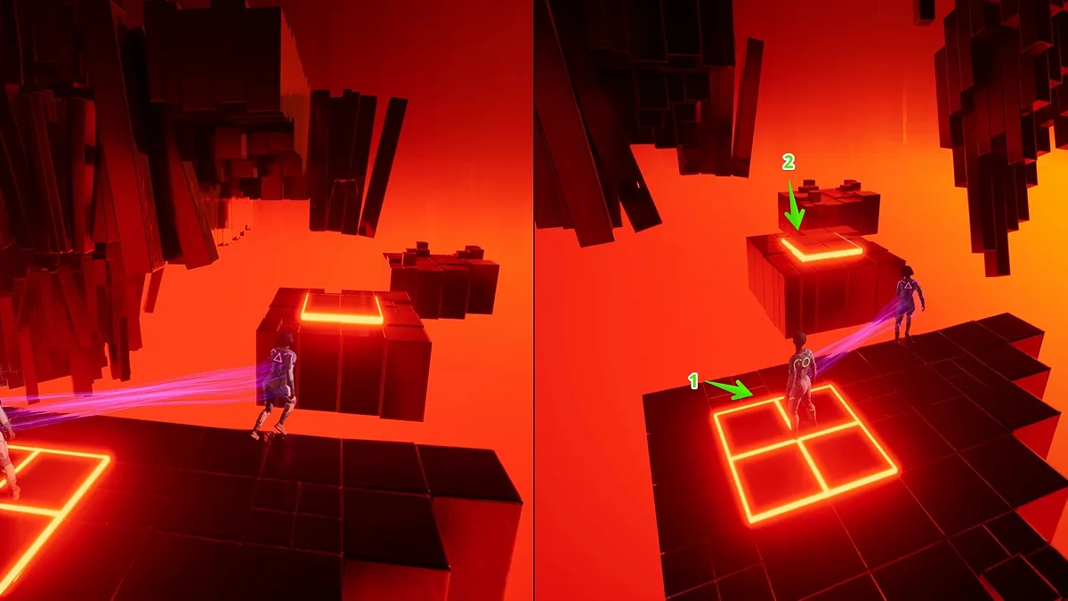 Вы окажетесь у обрыва. Игрок слева должен подтянуться к гравитационной платформе розового цвета и перерезать кабель, а второй персонаж использует его для преодоления препятствия. Так как первый игрок находится на стене, герой со способностью перемещать предметы подвигает к нему контейнер и перемещает его влево. Добравшись до края платформы, персонаж с оружием разбивает решётку, а второй игрок устраняет преграду в виде ящиков.