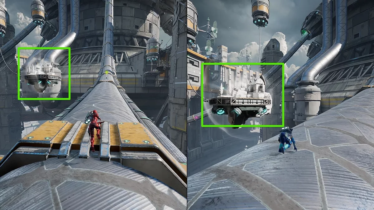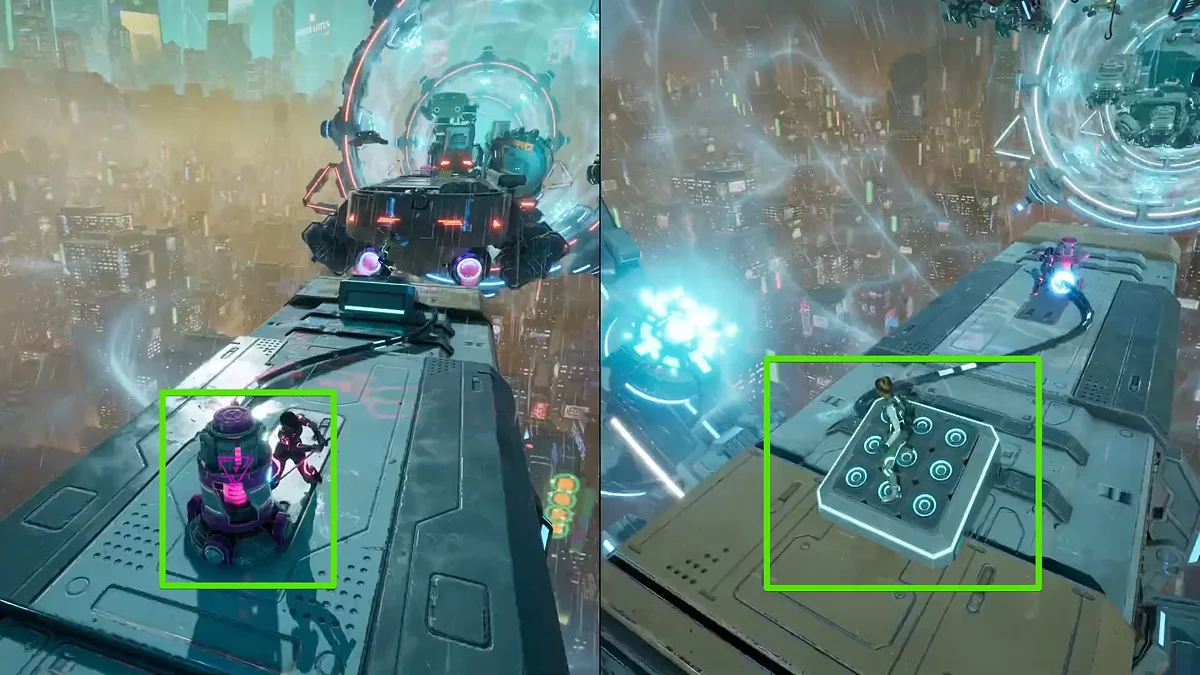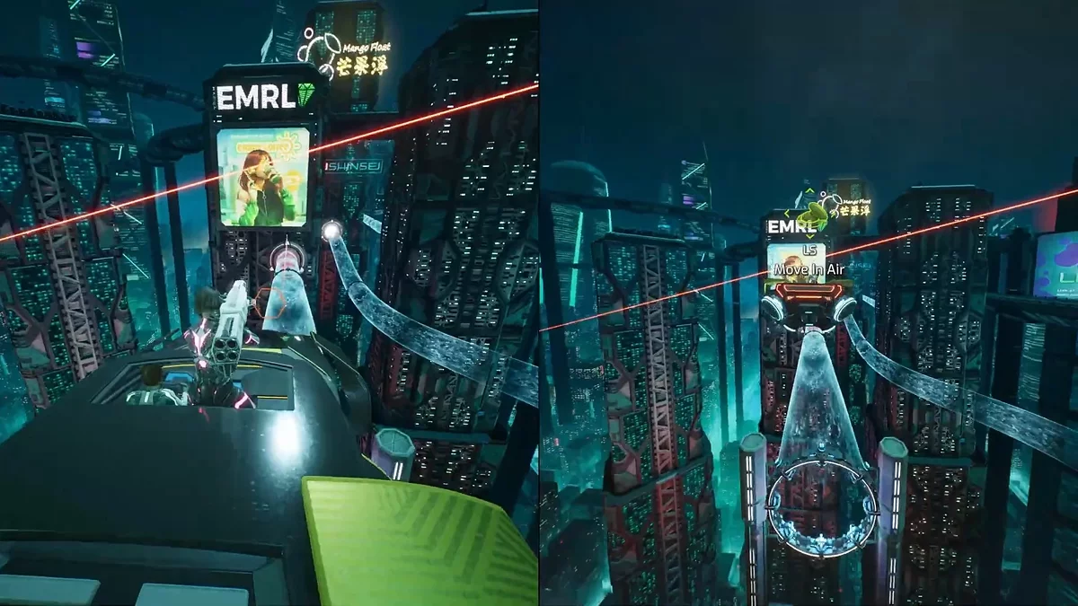 Далее вас ждёт сегмент с перемещением по летающим автомобилям. Используйте небольшие машины, чтобы добраться до грузовиков и продвинуться вперёд. На некоторых грузовиках вы также заметите места для зацепа и устройства, помогающие преодолевать большие расстояния, наподобие батутов. Первый игрок должен ударить оружием по ним для активации, а второй — встать на платформу.