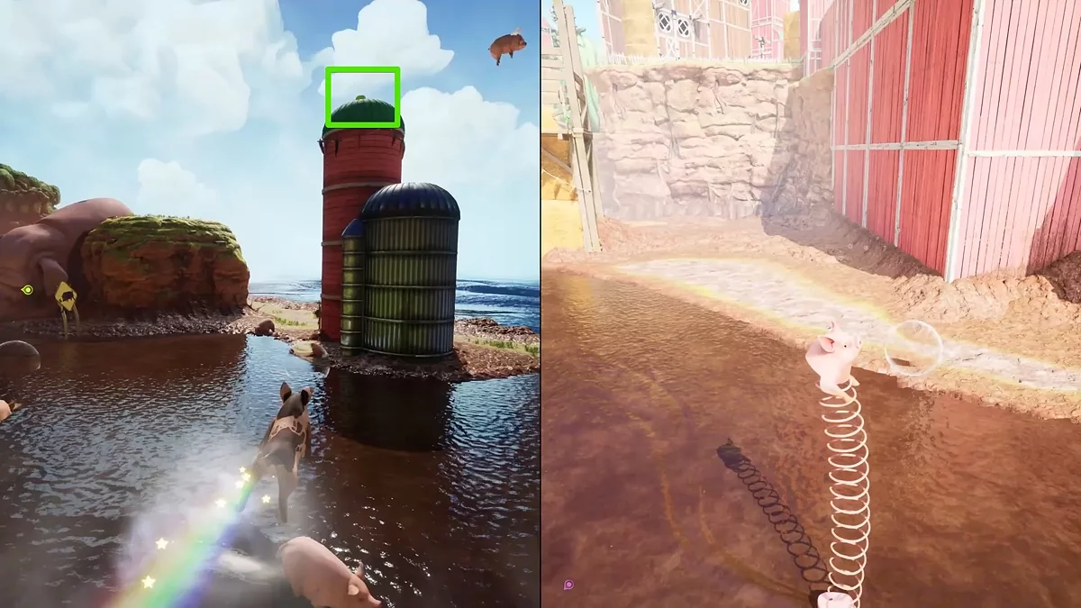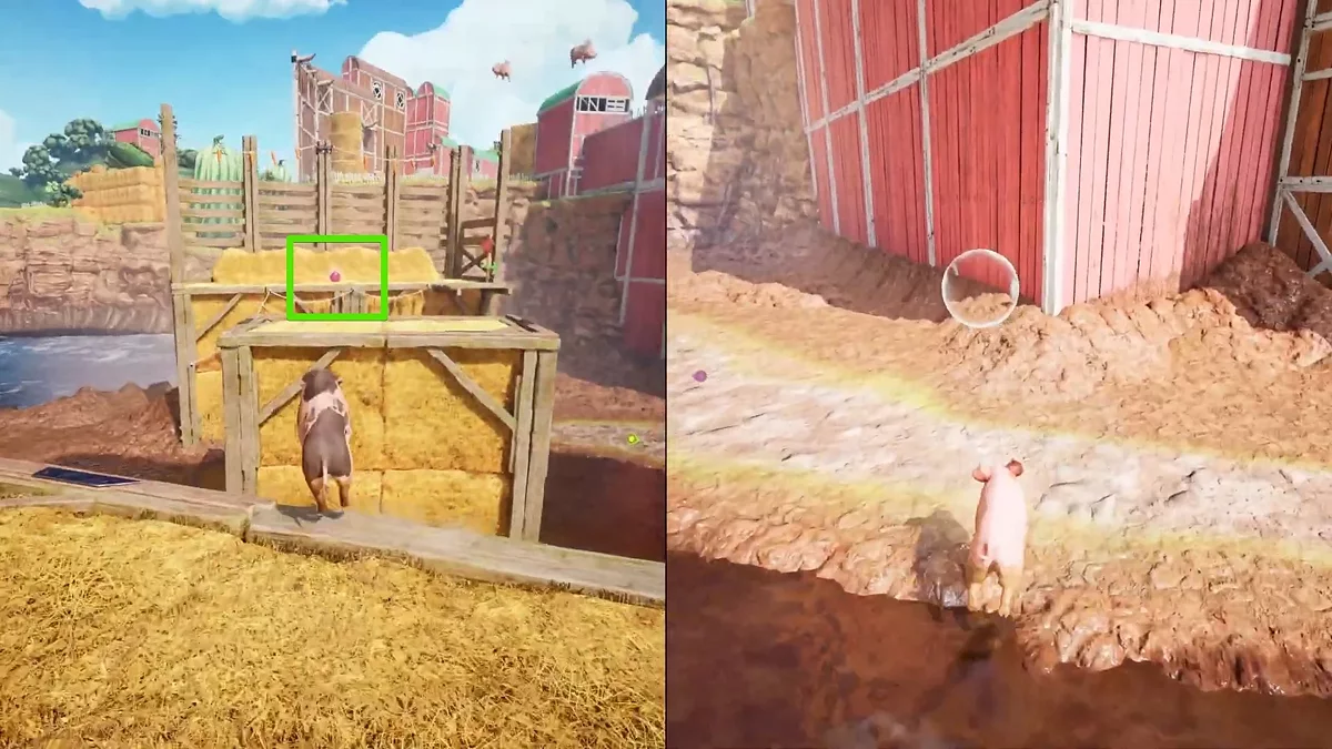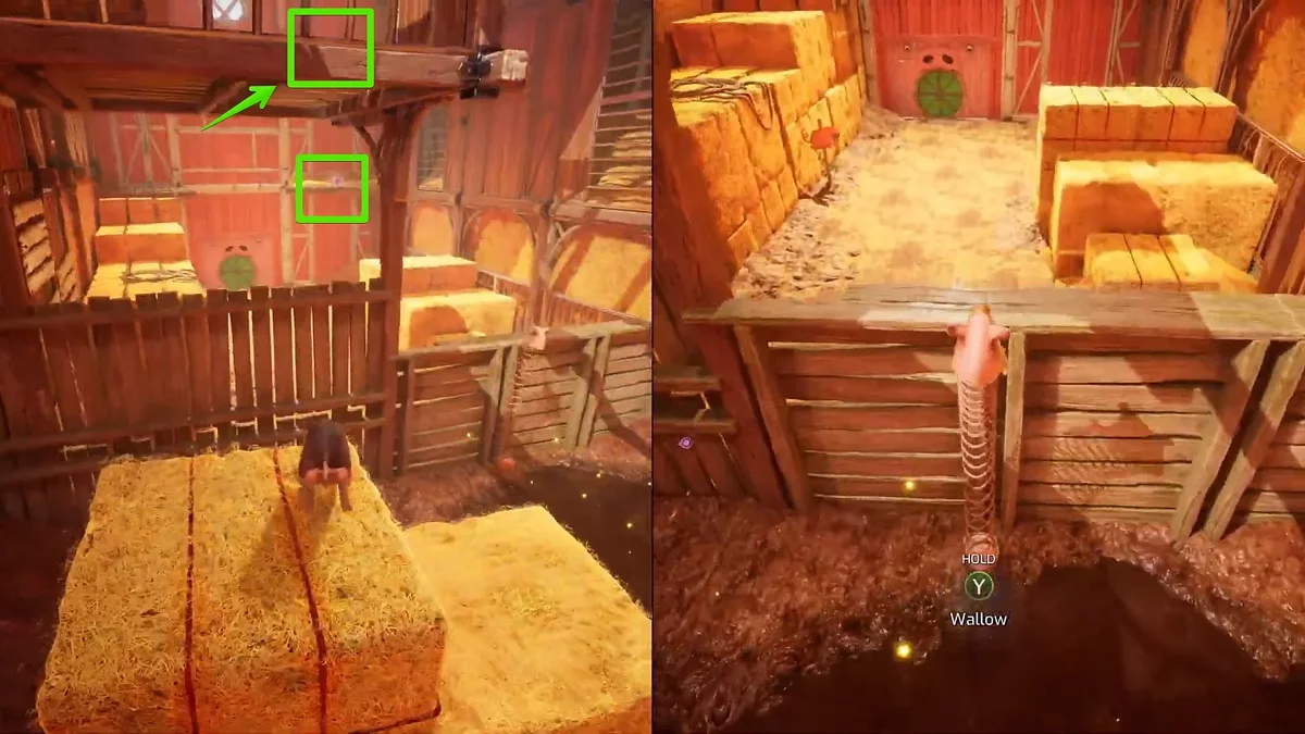 В следующей истории герои превратятся в свиней. Заберитесь на сено и при помощи способности преодолейте преграду. Вы услышите голос двери, которая попросит принести два яблока. Найдите их на верхних уровнях, чтобы пройти дальше. Исследуйте местность вокруг гигантской свиньи и подберите ещё два похожих яблока. Одно из них находится на деревянных платформах (фиолетовое), второе спрятано на вершине элеватора (зеленое). Используйте мыльные пузыри для высоких прыжков.