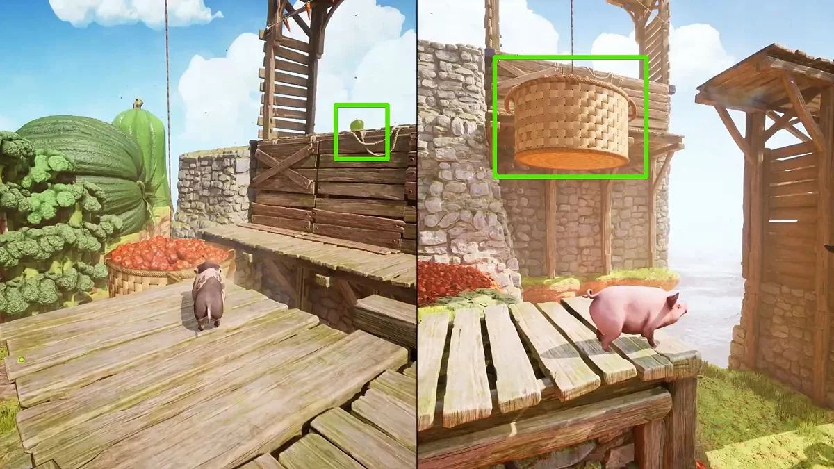 Добравшись до другой локации, можете разрушить хрупкий домик свиньи (опционально), после чего бегите до обрыва и перебирайтесь при помощи корзин. Забирайтесь в корзину воздушного шара и взаимодействуйте с ней, чтобы открыть.