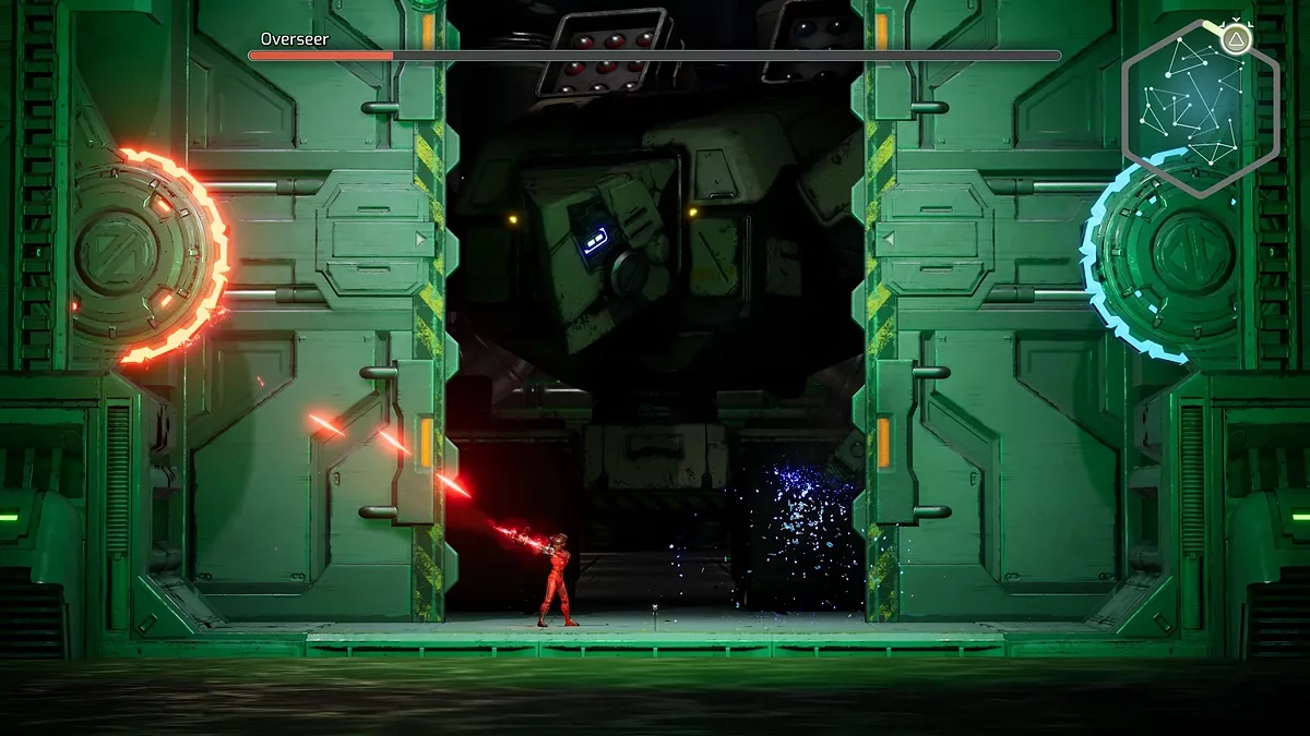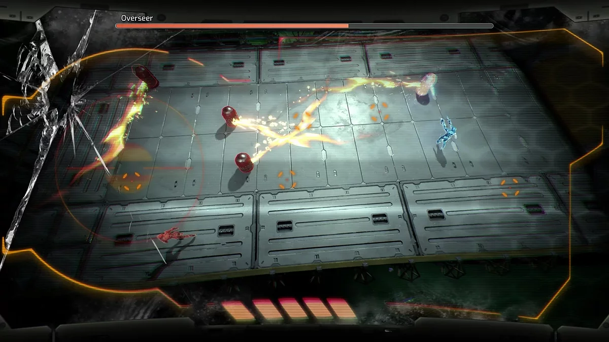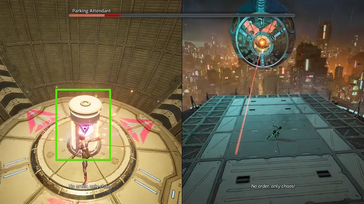 В первом сегменте сражения противник выпускает несколько автомобилей и мотобайков на арену, от которых следует вовремя увернуться. Далее он отмечает места, по которым будет наносить урон лазером. Когда босс отвернётся от персонажей, вы заметите на нём гравитационную платформу. Используйте её и доберитесь до ядра, параллельно уворачиваясь от лучей.