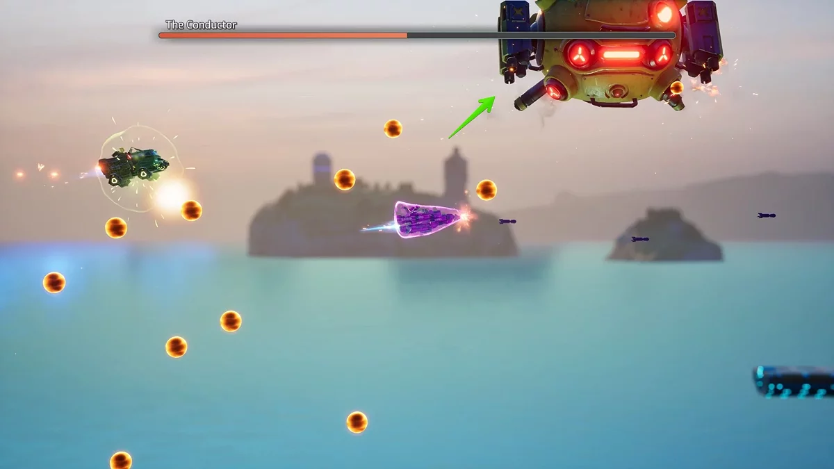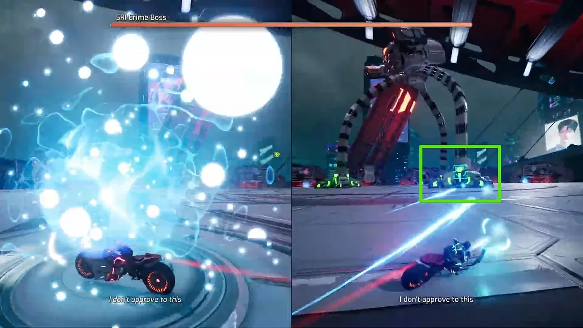 Как вы уже догадались, сражение с очередным боссом будет проходить на байках. Подбирайте светящиеся сферы-заряды, чтобы атаковать врага. Когда у противника останется меньше половины здоровья, начнут появляться самолёты, атакующие вас с воздуха. Мы рекомендуем сперва избавляться от этих машин, лишь затем сосредоточить огонь на основном противнике.