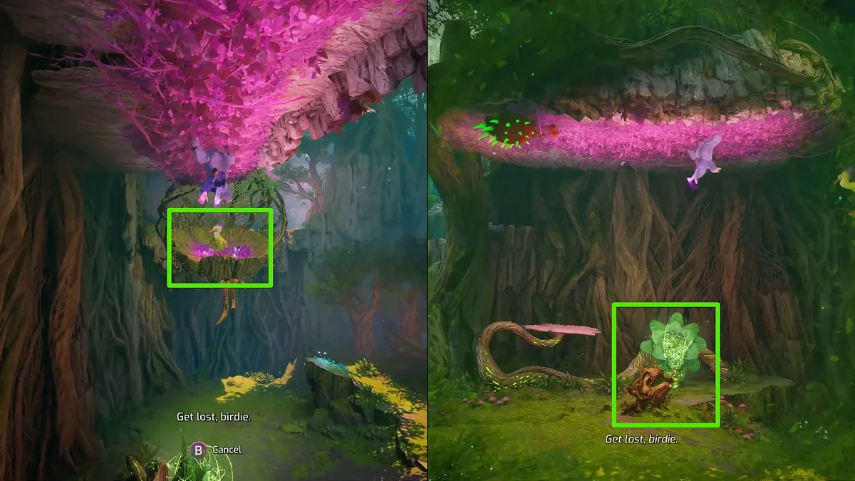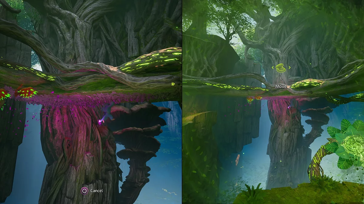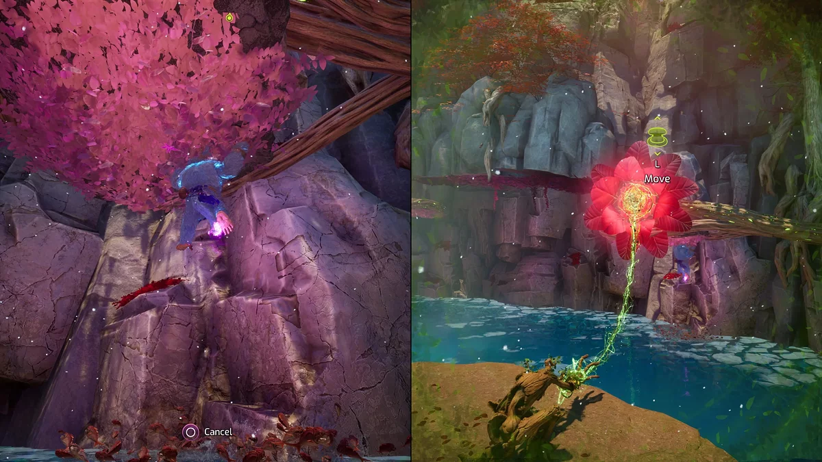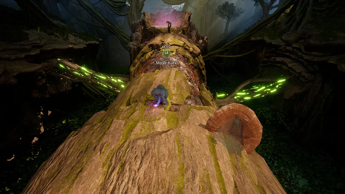 Войдите в гигантское дерево и доберитесь до лозы с фиолетовым свечением. Избавьтесь от неё при помощи способности обезьяны, затем смотрите катсцену. По окончании видеоролика первый игрок как обычно должен управлять своим героем, однако второй геймер напрямую влияет на окружение.