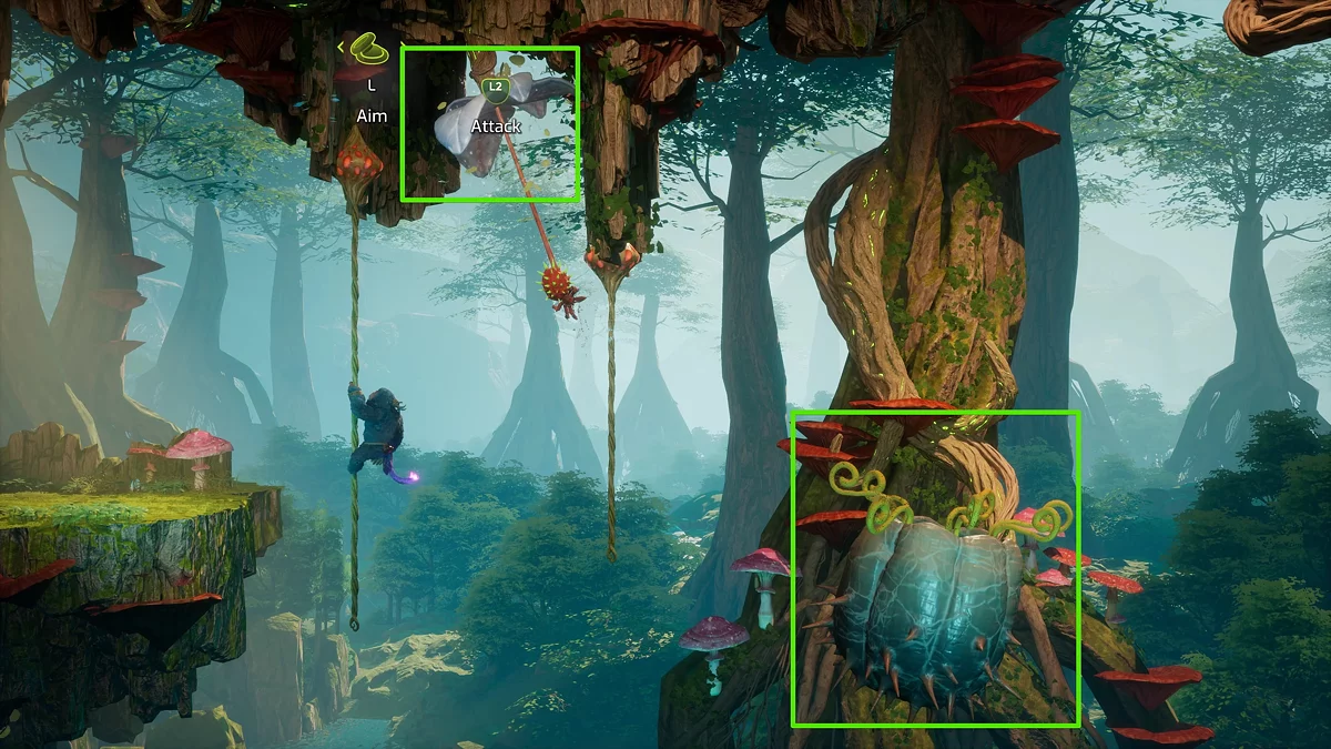 Пробирайтесь вперёд каждый по своей тропе, а когда воссоединитесь, придётся помогать друг другу. Второй игрок переходит в форму дерева и активирует батут, чтобы первый персонаж в форме гориллы зацепился за отвесную скалу и опустил импровизированную корзину вниз.