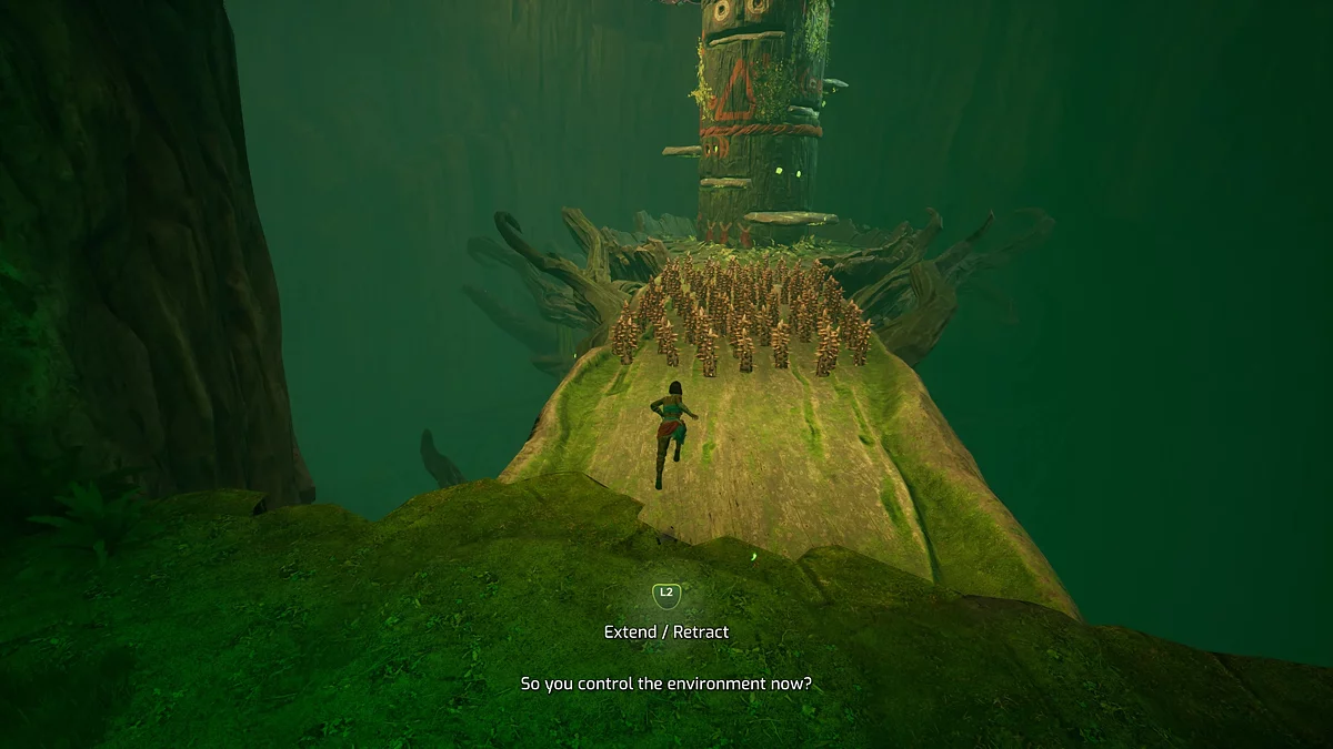 Когда снова воссоединитесь с напарником, Зои запрыгивает на ствол дерева в воде и при помощи стика пытается не попасть в щупальцы, расставленные на пути. Придётся подниматься или опускаться, а также уворачиваться в стороны. Первый персонаж все это время должен тащить ствол вперёд. Оказавшись в тупике, найдите на стене слева захват, куда можно зацепиться и пробежать вперёд по стене. Так вы доберётесь до портала, использовав который, окажетесь в локации с боссом.