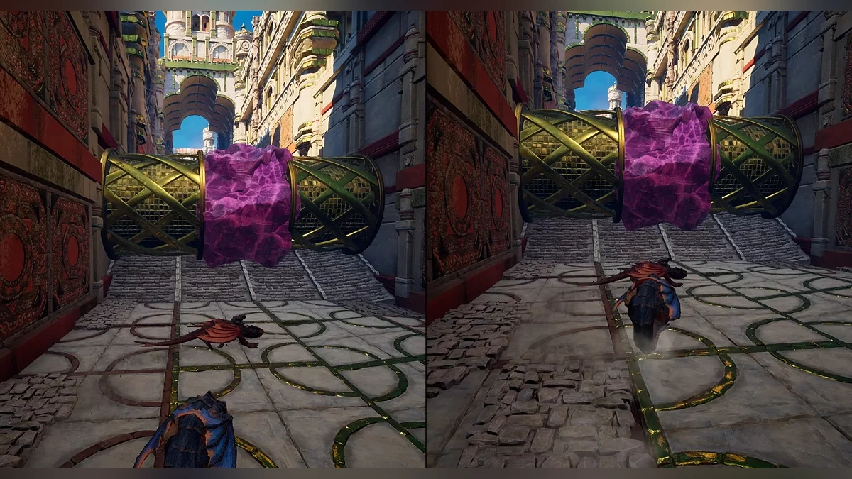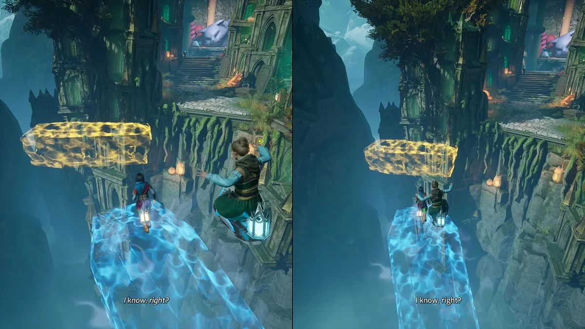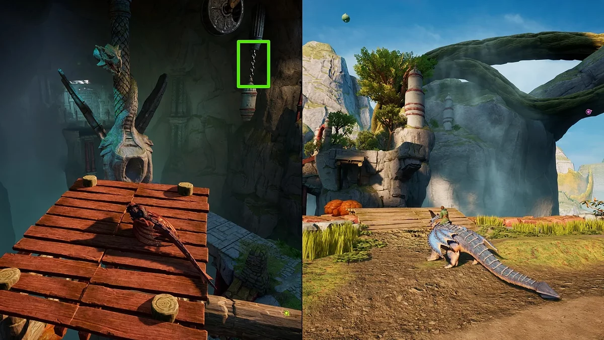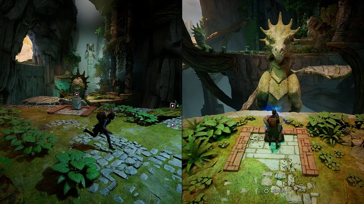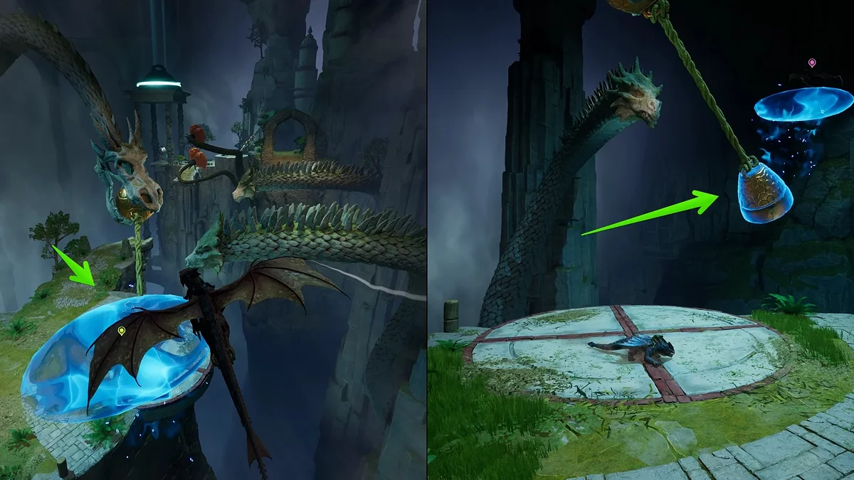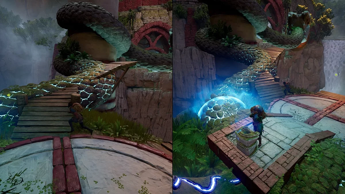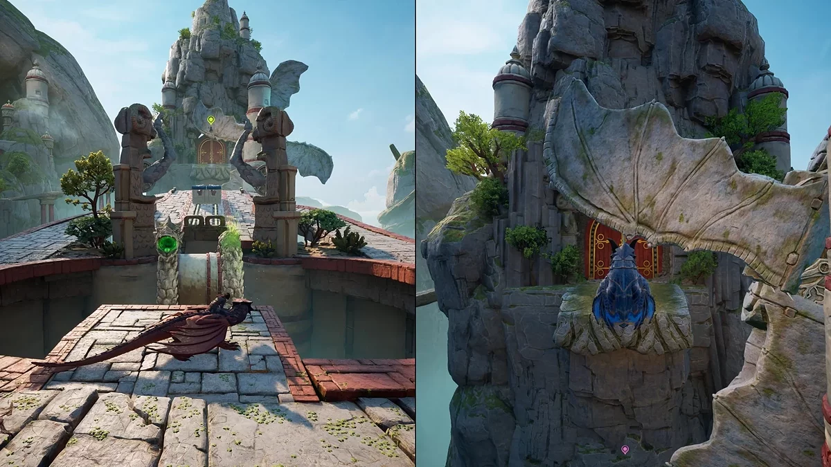 Гигантская статуя повернётся в правую сторону, открыв доступ к плющу для игрока на синем драконе. Приятель же сможет спланировать до воздушного потока и перебраться. Игра также начнёт постепенно знакомить вас с розовыми кристаллами, которые может разбивать Зои.