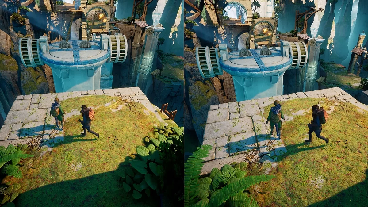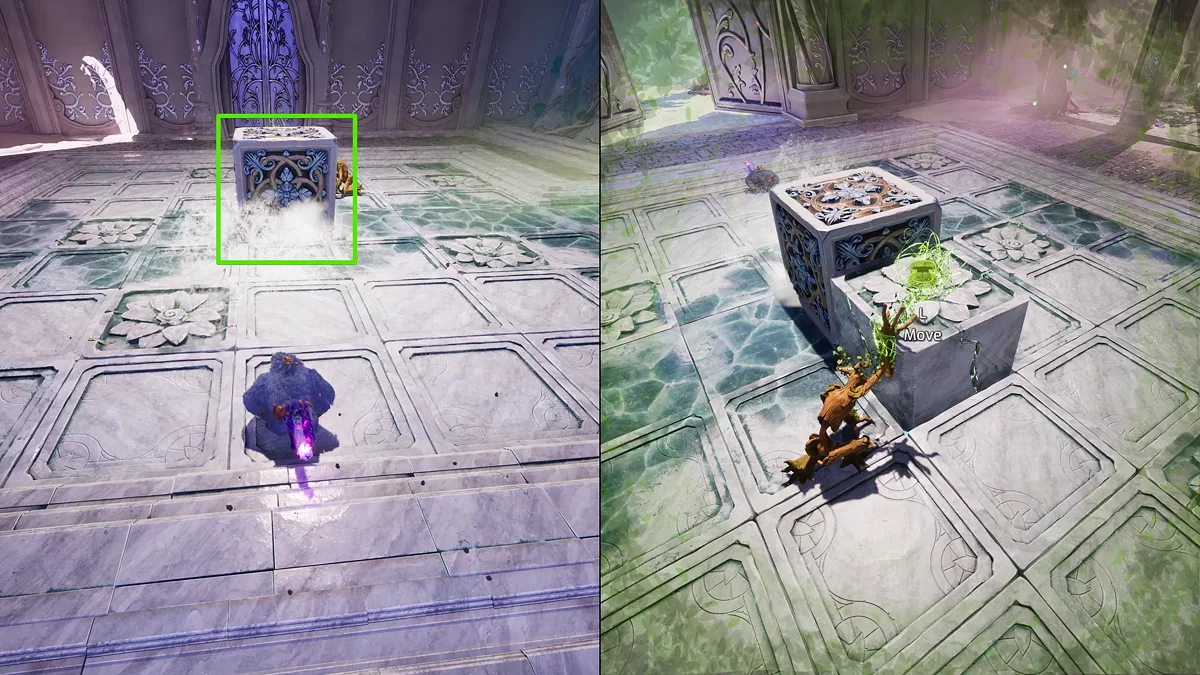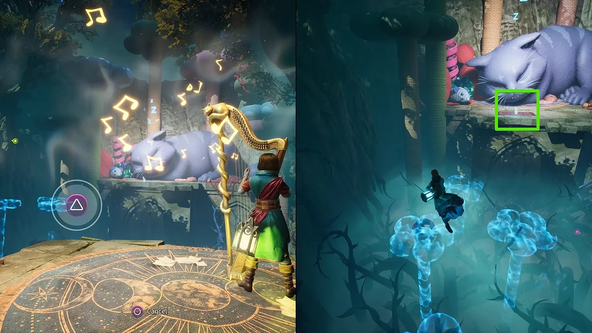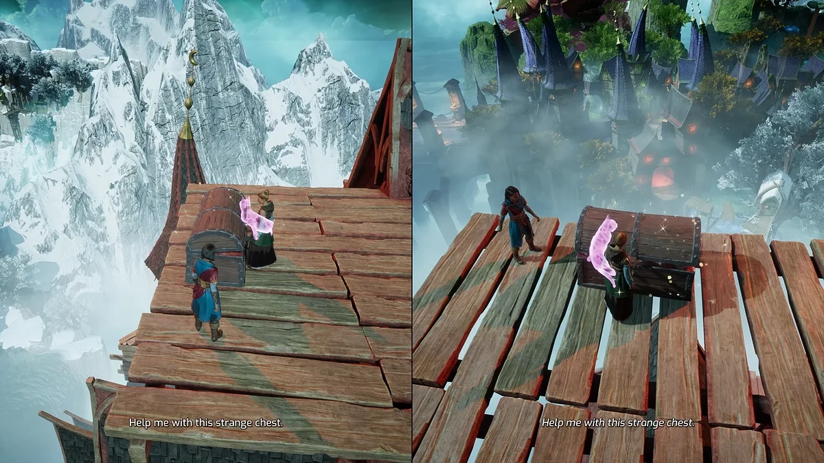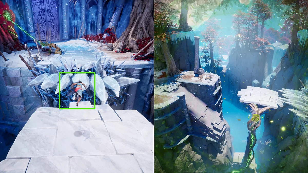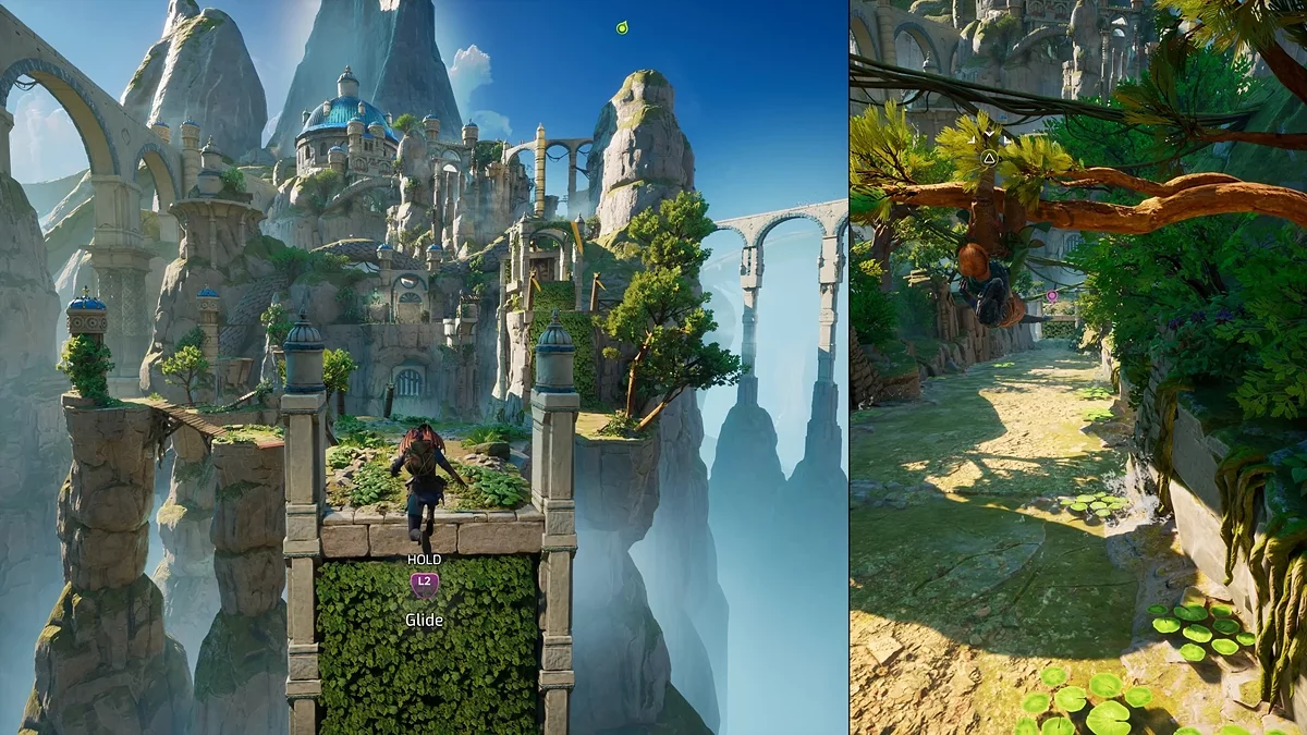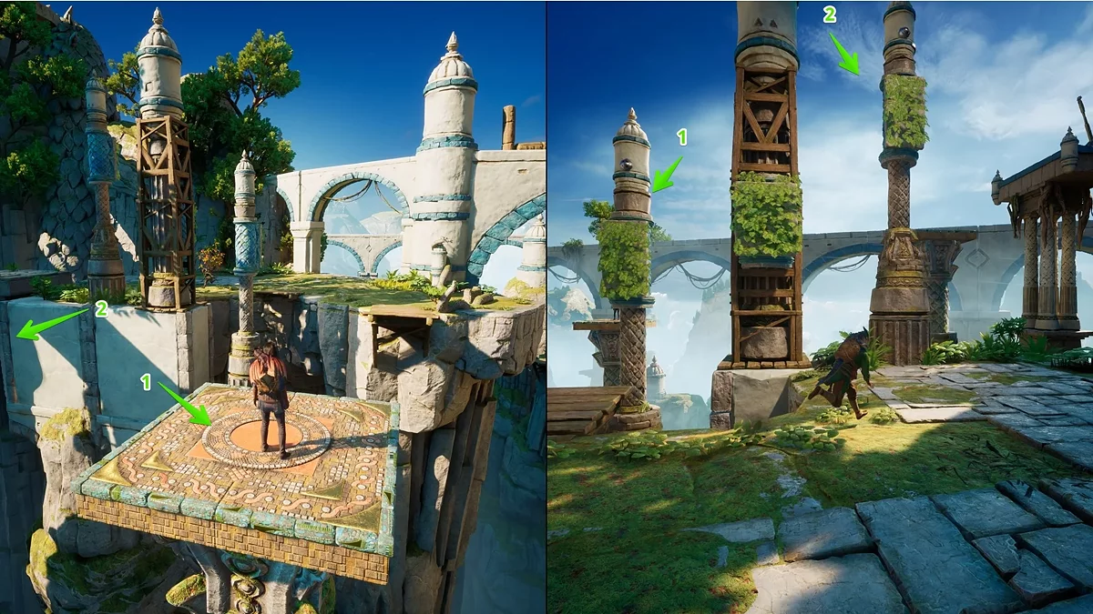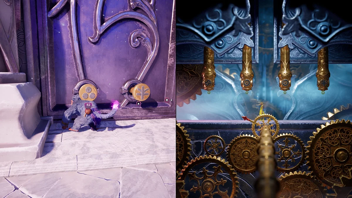 Гигантская статуя повернётся в правую сторону, открыв доступ к плющу для игрока на синем драконе. Приятель же сможет спланировать до воздушного потока и перебраться. Игра также начнёт постепенно знакомить вас с розовыми кристаллами, которые может разбивать Зои.