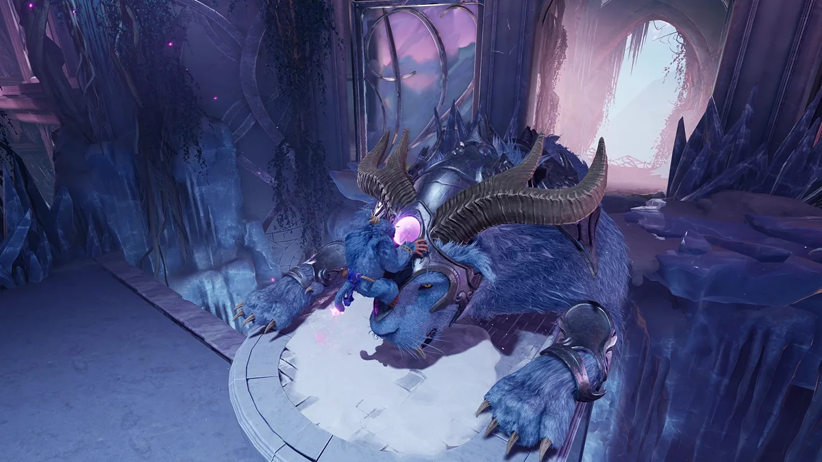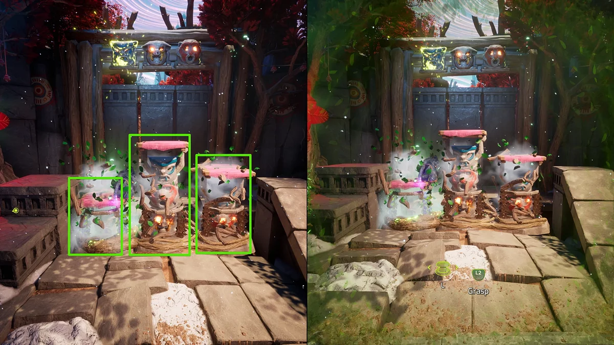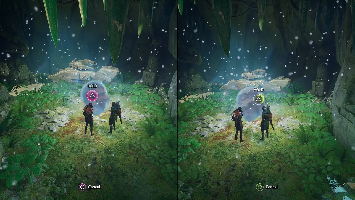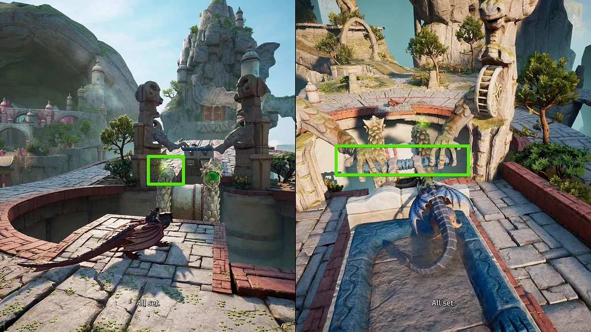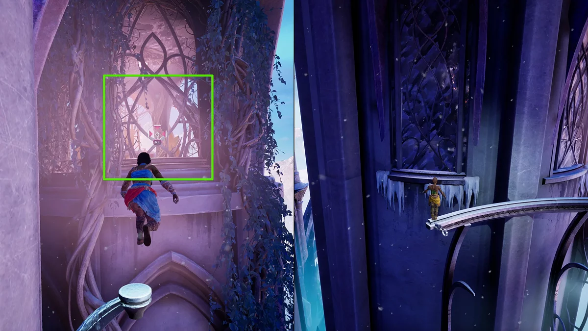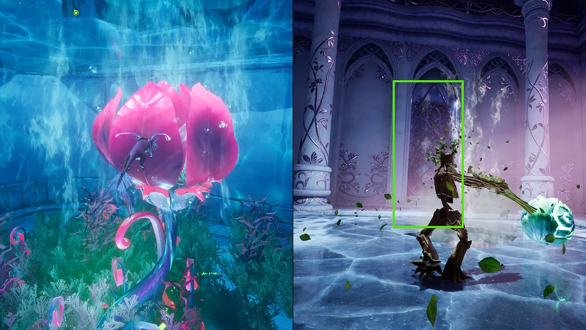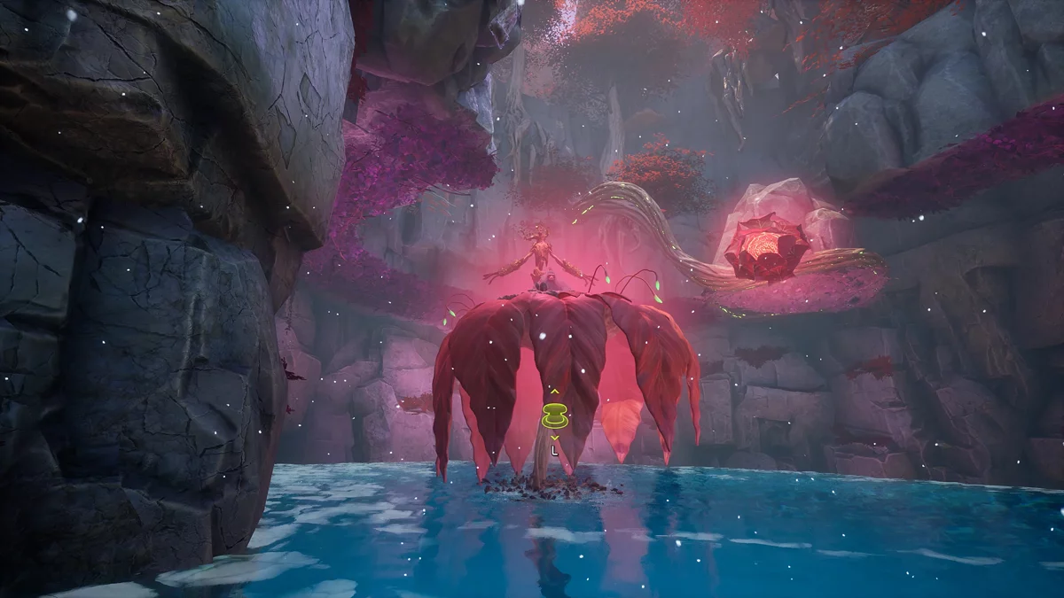 Гигантская статуя повернётся в правую сторону, открыв доступ к плющу для игрока на синем драконе. Приятель же сможет спланировать до воздушного потока и перебраться. Игра также начнёт постепенно знакомить вас с розовыми кристаллами, которые может разбивать Зои.