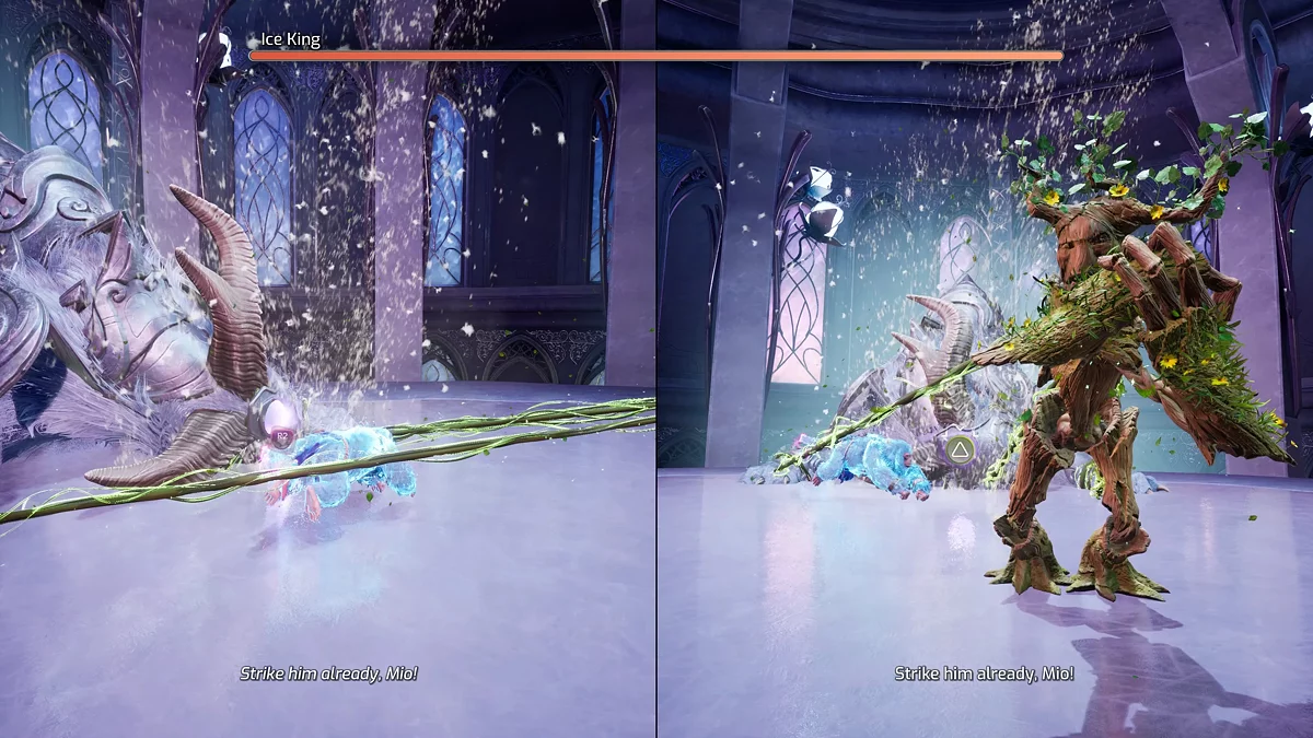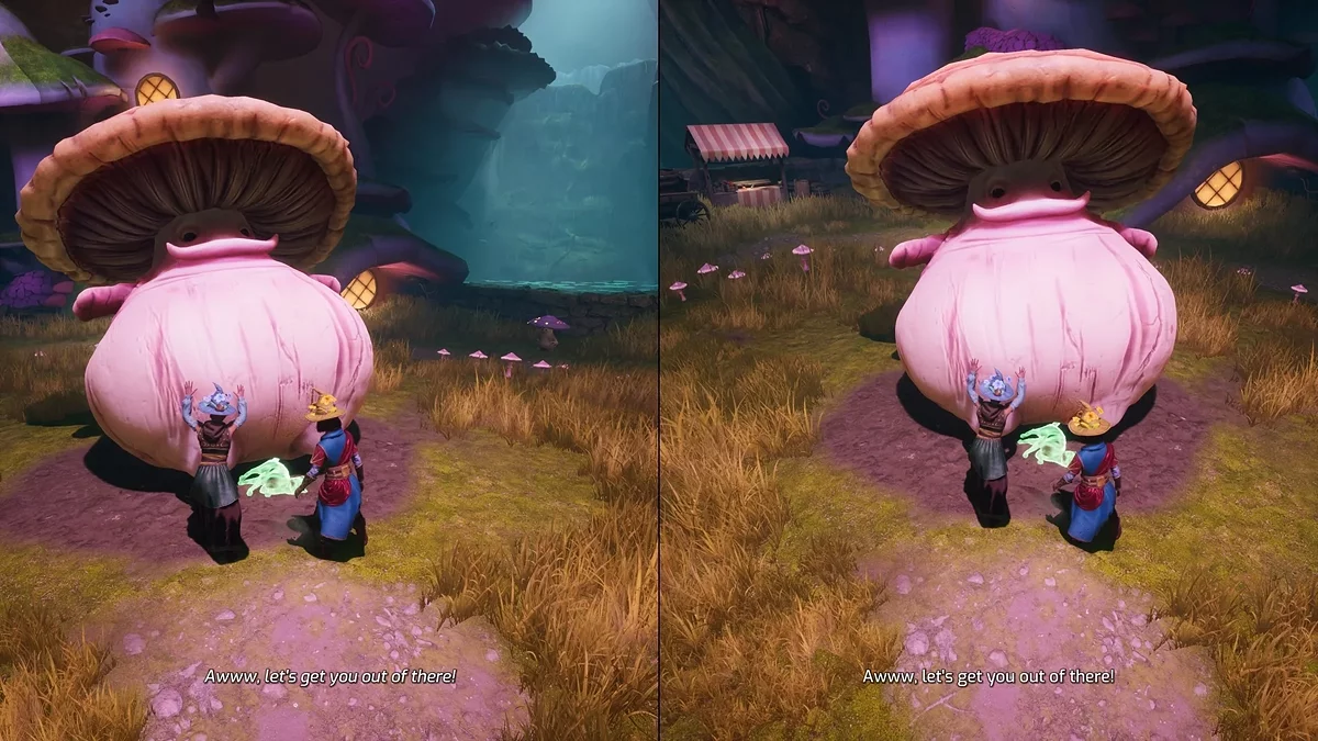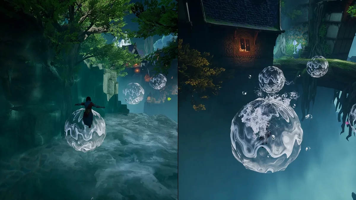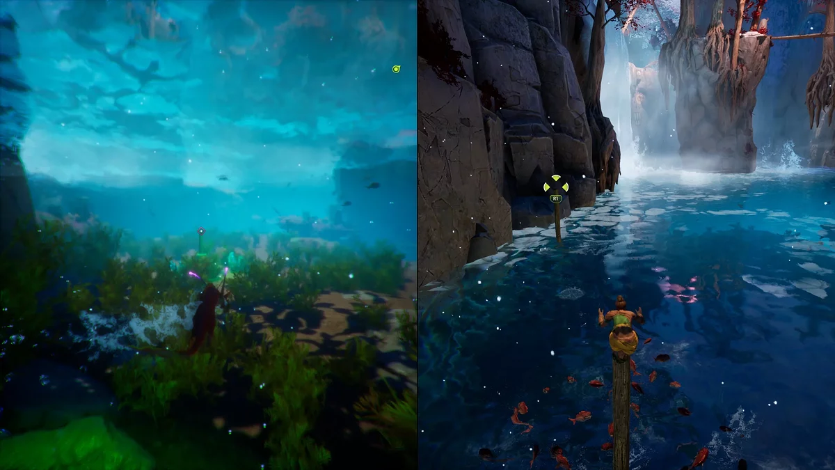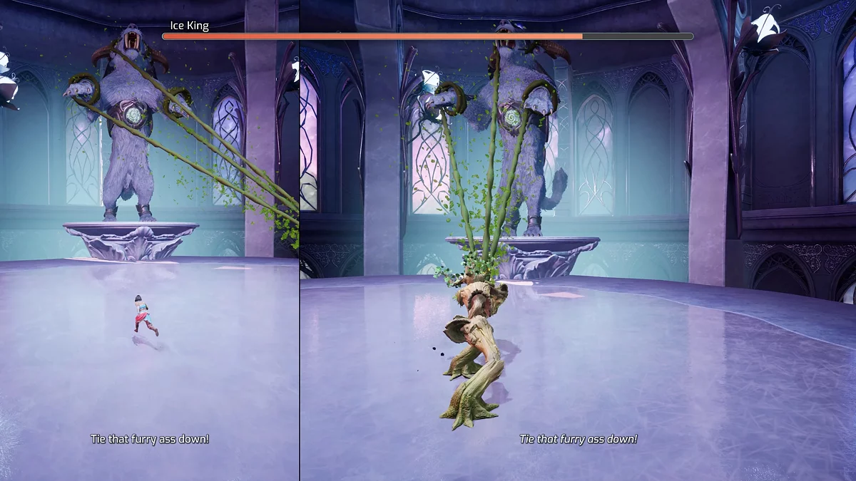 Немного дальше, когда игра превратится в 2D-платформер, примите форму гориллы и бейте по корням деревьев, тем самым вращая их и открывая проход вашему союзнику. Далее второй игрок в форме феи использует цветочные потоки, а первый персонаж преодолевает препятствия в форме рыбы.