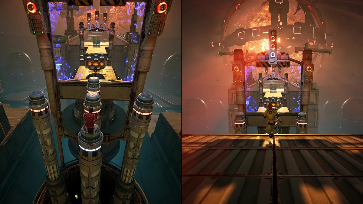 Перемещайтесь по подвижным платформам, затем по узким разрушенным стенам до вращающейся платформы, откуда сможете попасть к вращающейся лопасти. Один игрок должен остановить вращение колеса, чтобы другой прошёл. Когда первый игрок перестанет взаимодействовать с устройством, у него будет несколько секунд, чтобы пройти через колесо.