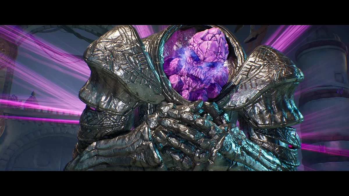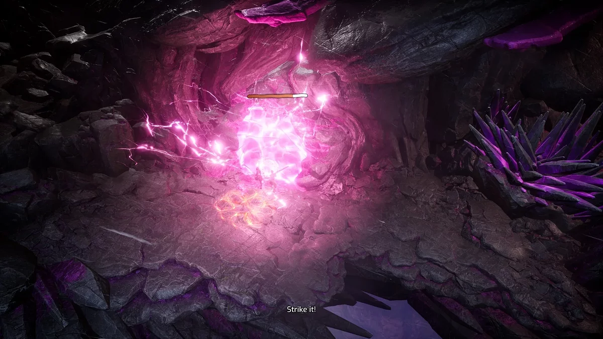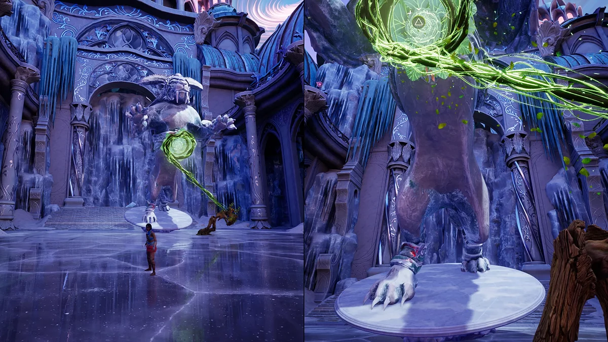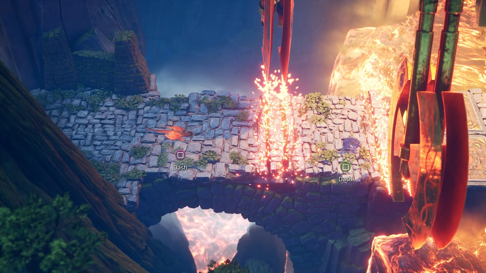 Проход слева заперт — бегите в правую сторону. Вам нужно преодолеть мост, минуя столпы огня из колонн. Для этого воспользуйтесь рывком. Сделав это, окажетесь на небольшой арене, где появится враг — гигантская перчатка из металла и кристаллов. Расплавьте металл ядом, после чего разбейте кристалл ударом синего дракона.