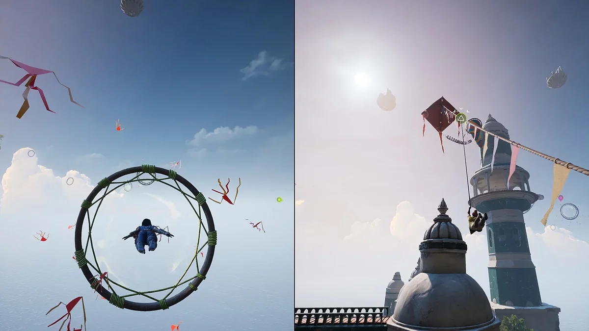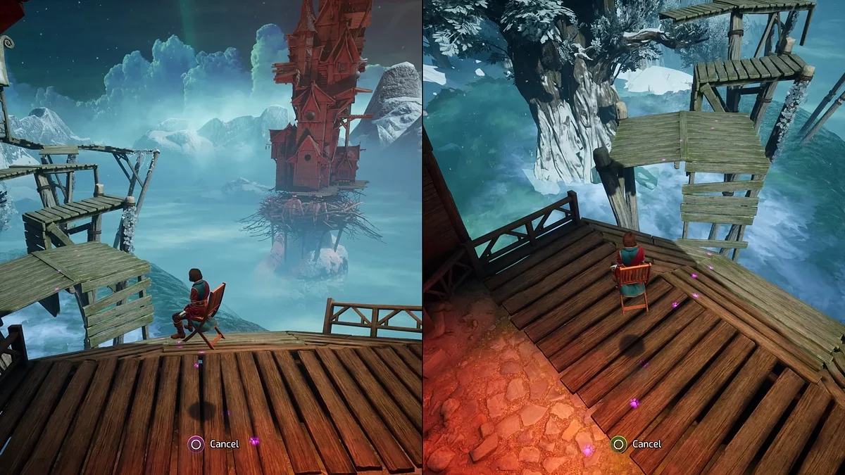 Вставьте яйца в соответствующие стойки и вращайте вторую статую так, чтобы перебраться по крыльям через обрыв. В этот момент ваш приятель должен также вставить яйцо, которое позволит поднять крылья выше. Немного паркура и вы окажетесь на неподвижной платформе с двумя стойками для яиц. Вставьте их и смотрите катсцену, по завершении которой игра перейдёт в 2D-плафтормер. В этом сегменте прохождения нужно всего лишь быстро перепрыгивать по разрушающимся платформам и вовремя использовать крюк для захвата.