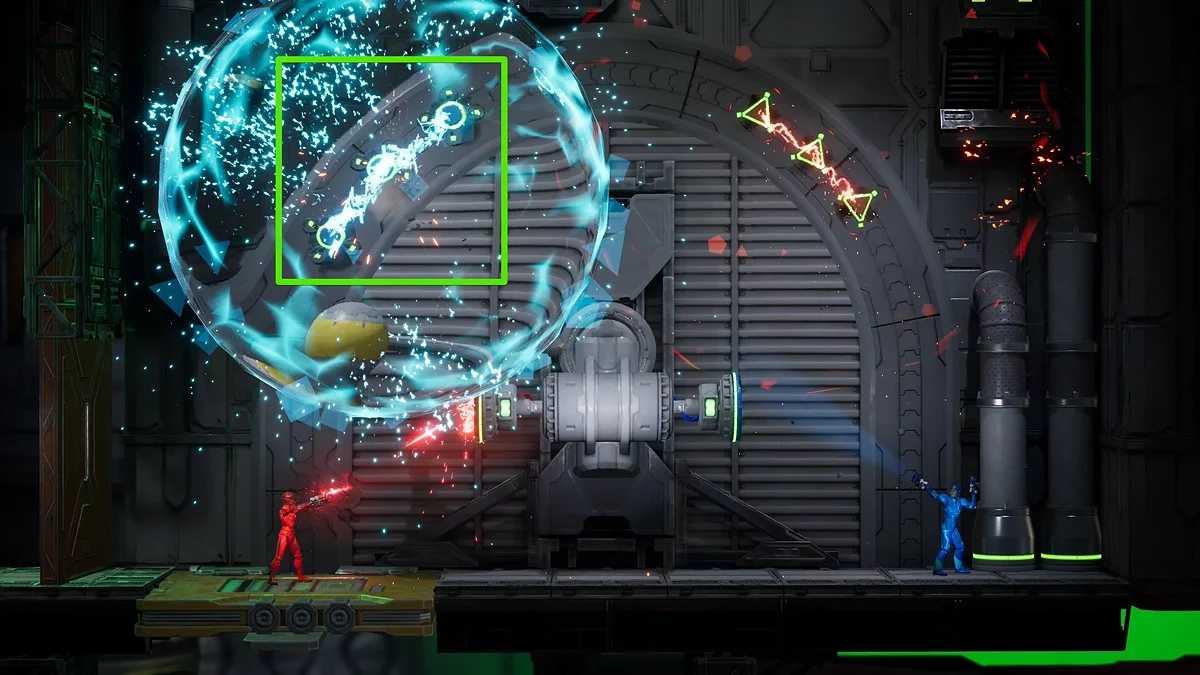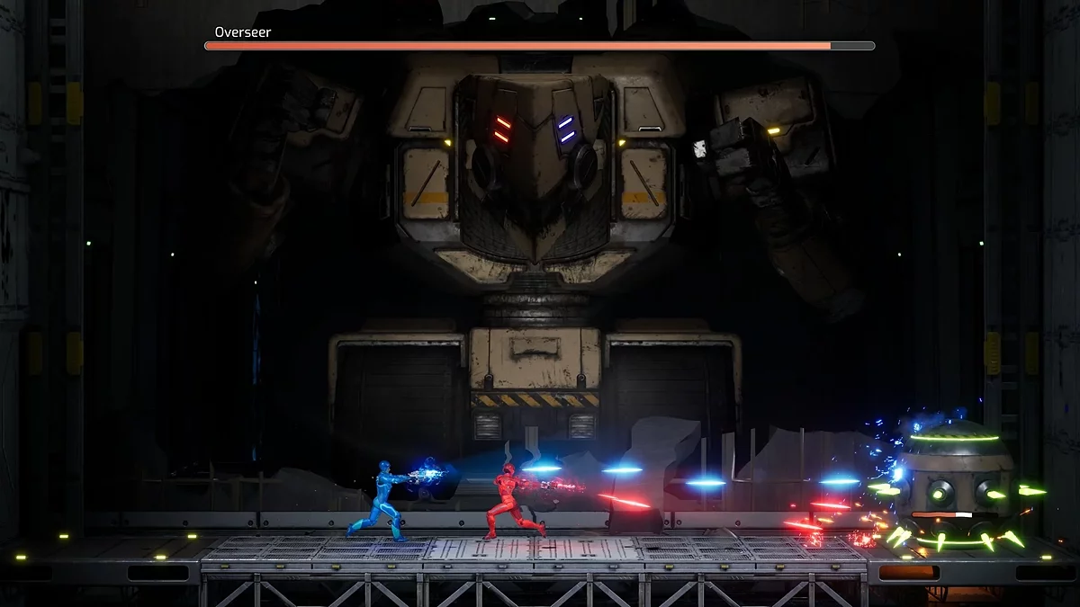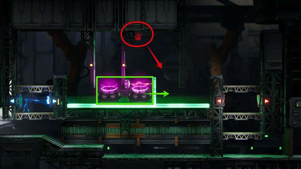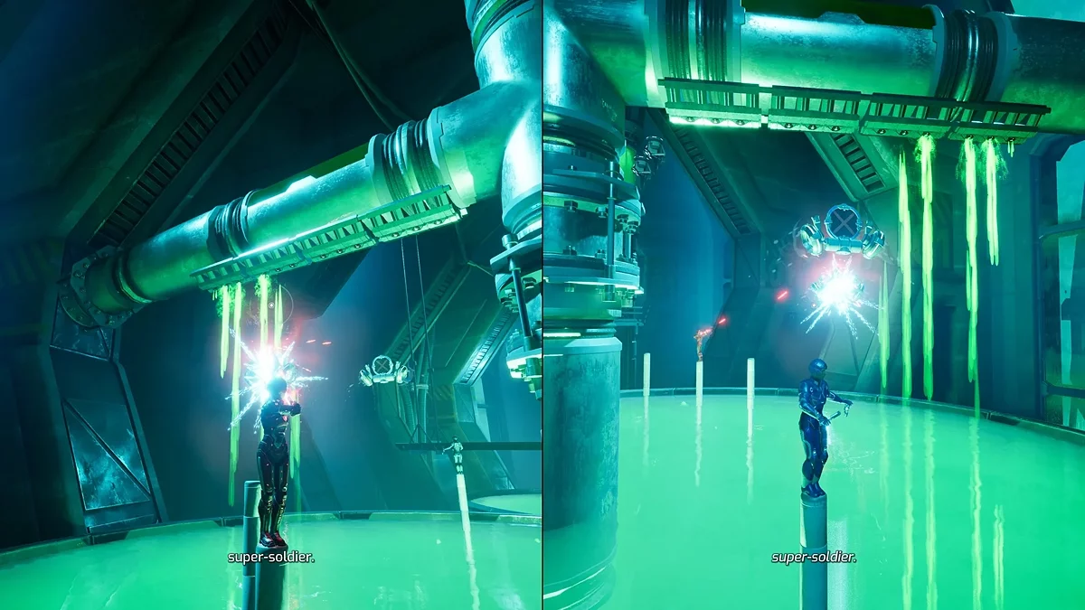 Поднимитесь на лифте выше и хватайтесь за ближайший уступ. Немного ниже вы увидите противников, одолев которых, первый игрок должен использовать гравитационную платформу. В этот же момент на возвышенности станут появляться и другие враги — второй персонаж должен уничтожать их, пока первых пробирается вперёд. Помимо этого Зои должна прокладывать путь напарнику при помощи зелёных стержней.
