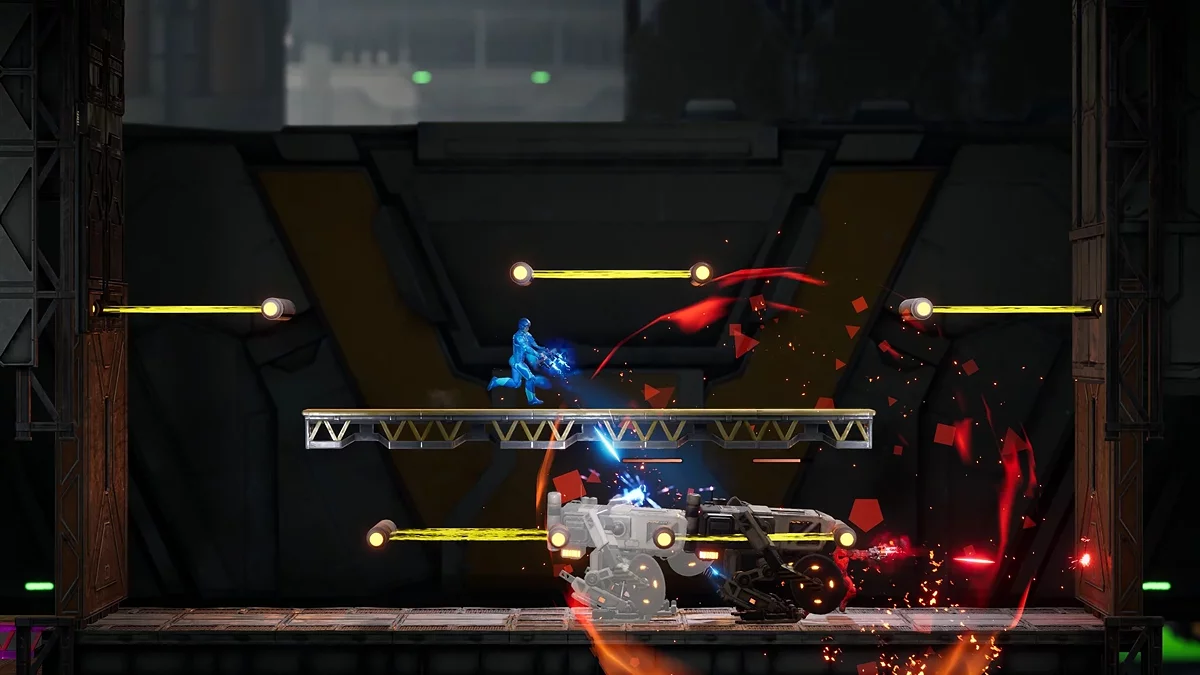 Дальше вас ждёт платформерный уровень, где нужно бежать вперёд, преодолевая препятствия и уворачиваясь от лазерного луча. Когда окажетесь в тупике, подождите, пока платформа справа от автомобилей не упадёт вниз. Поднявшись на лифте на крышу, начнётся сражение с боссом.