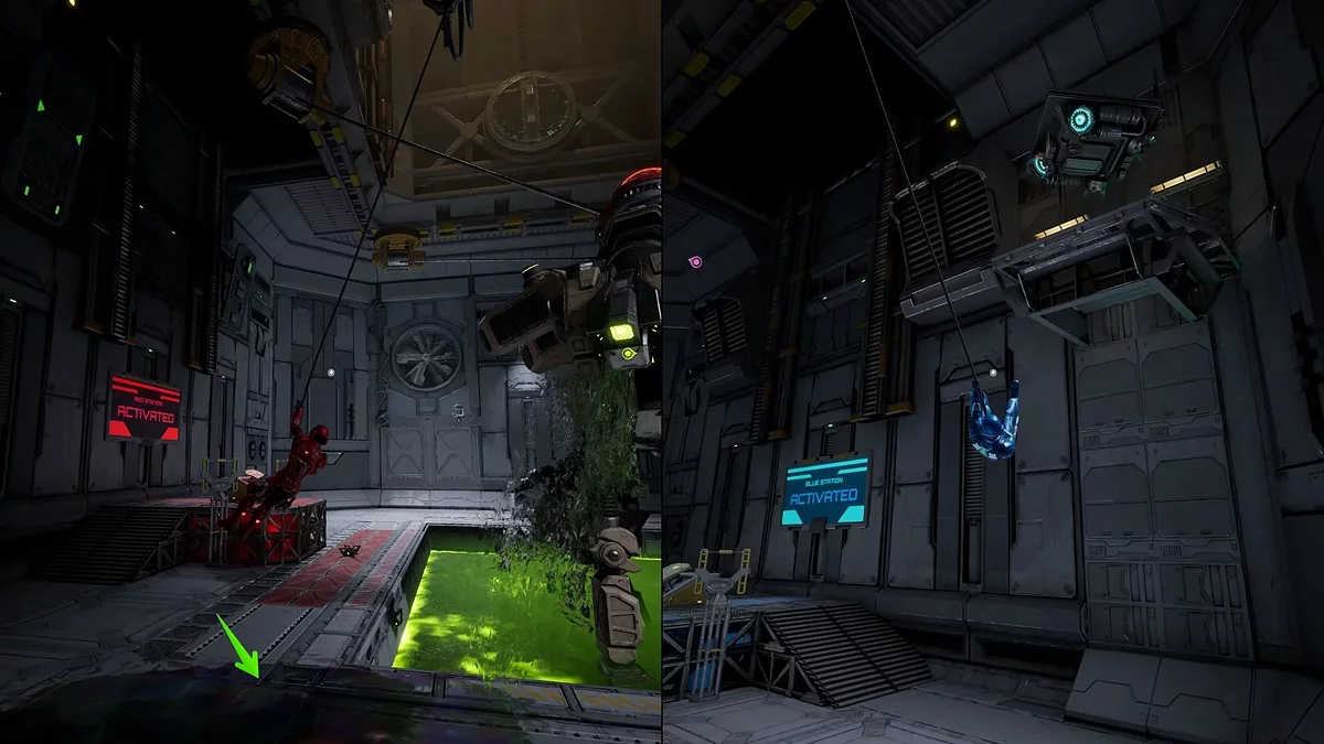 Откройте проход в коридор, чтобы первый игрок смог воспользоваться очередной грави платформой. Сбросьте вниз все контейнеры и помогите союзнику перебежать по ним. Оказавшись в помещении с рычагом, второй геймер должен выдвинуть стержни справа и слева, чтобы приятель уничтожил их.