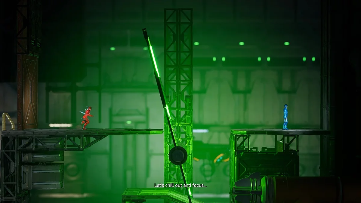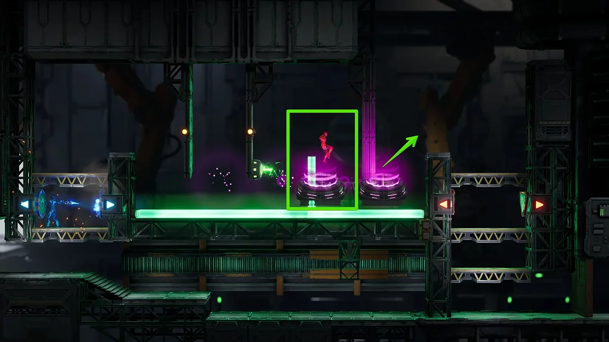 Как только первый игрок доберётся до устройства, которое активирует батут, второй персонаж становится на него и ждёт удара. Поднявшись выше, бросайте зелёные стержни в двигающиеся платформы, это поможет приятелю пройти дальше.