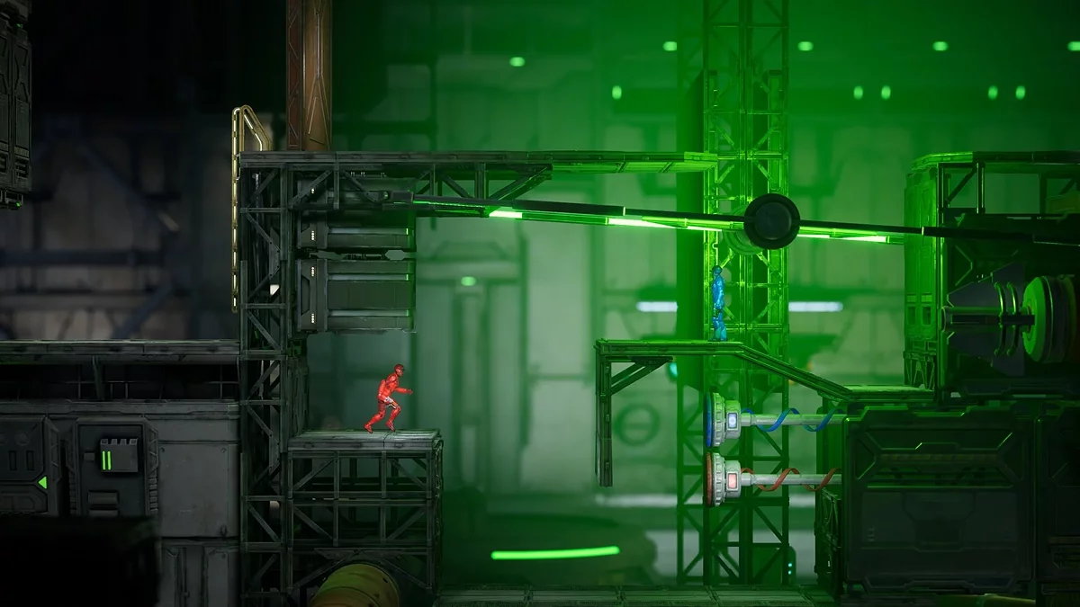 Когда игра вдруг станет 2D-платформером, воспользуйтесь гравитационной платформой и пробегите вниз по трубам, чтобы активировать мост. Пробирайтесь дальше при помощи способностей, помогая друг другу, пока не начнётся катсцена.