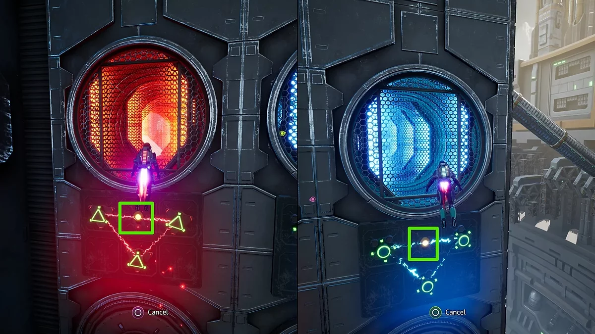 Когда платформа перед вами взорвется, схватитесь за ближайшую площадку и следуйте вперёд, обходя препятствия по стенам. Вскоре вы доберетесь до вертикальных опор, по которым придётся перебраться. Обратите внимание, что поршни некоторых опор будут перемещаться. Оказавшись у терминала, следите за метками слева и справа на экране и взаимодействуйте с консолью, когда они будут ровно по центру, чтобы заполнить шкалу.