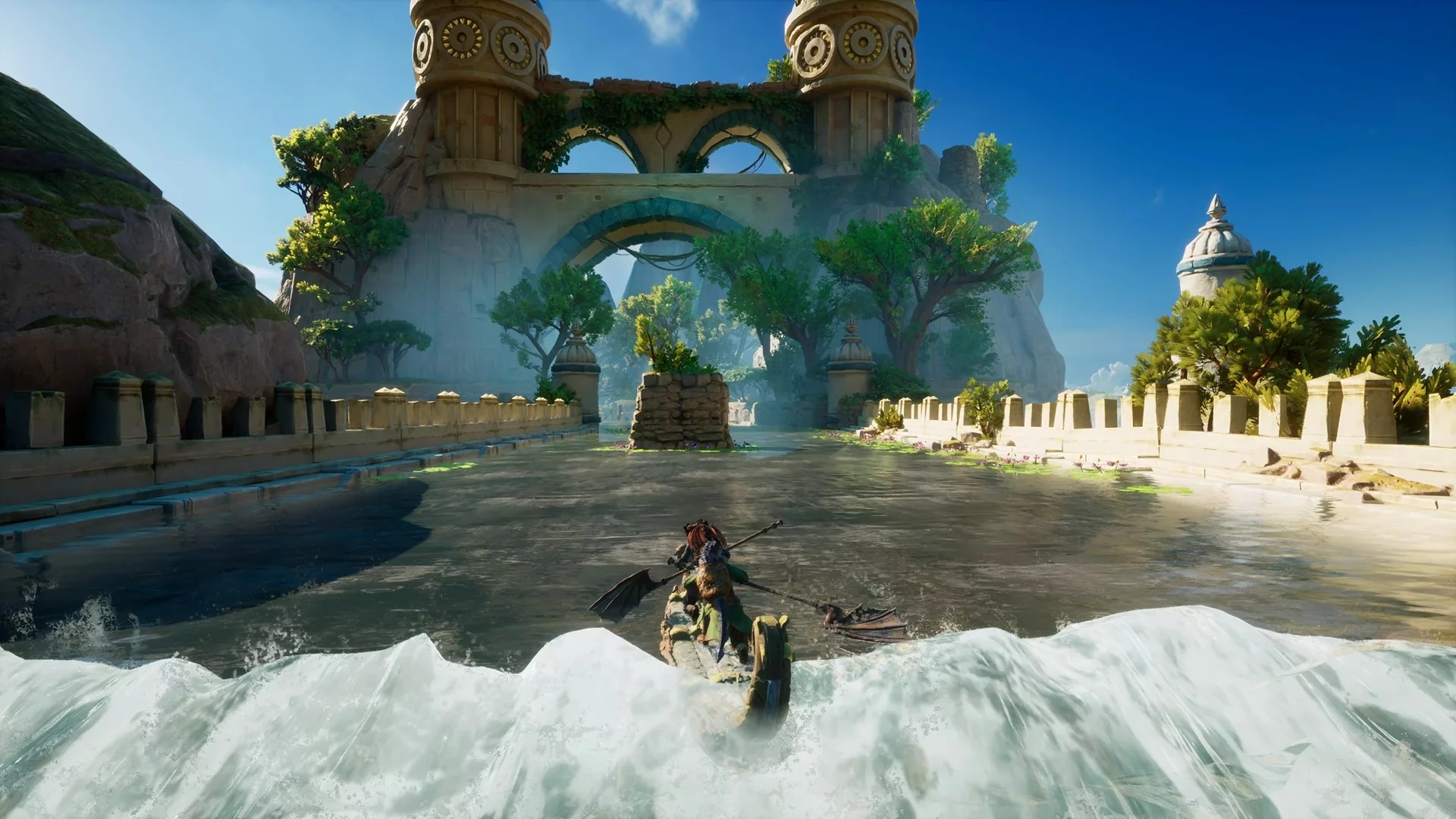 Следуйте по платформам, пока не доберётесь до вращающихся водяных колёс. Зои должна забраться выше, а Мио управляет движением колёс при помощи двух колонн. Затем зацепитесь за плющ на верхнем уровне, предварительно приятель должен схватиться за крюк над обрывом. Так Зои поднимется выше и сможете воссоединиться с другом. Здесь можно запустить опциональную катсцену, если взаимодействовать с каменной скамьёй.