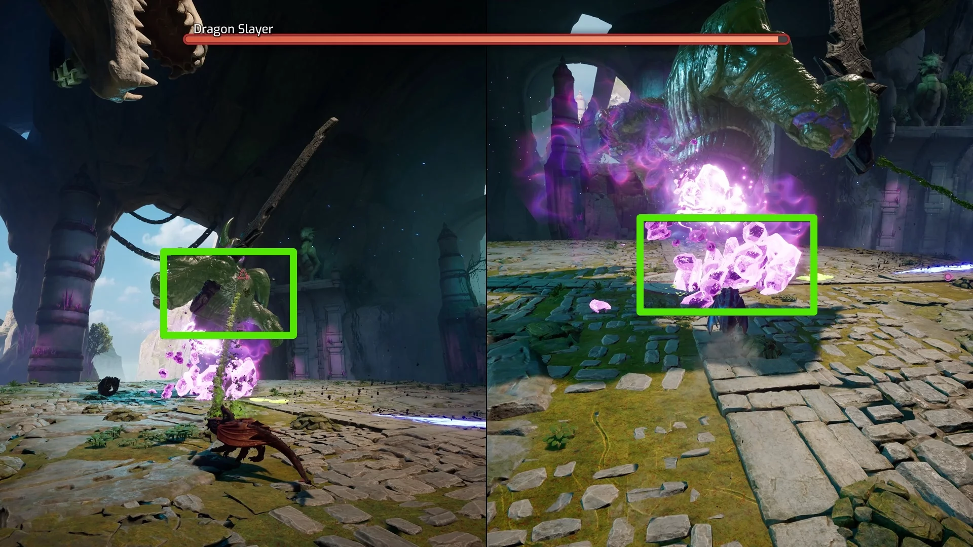 Помимо этого, обращайте внимание на синие светящиеся круги на земле. В эти места в скором времени босс разбросает сгустки энергии, наносящие урон. Немного позже противник начнёт использовать и другие атаки по области. Продолжайте атаковать кислотой, а чтобы сбивать атаки босса, синий дракон должен вовремя бить по нижней его части.