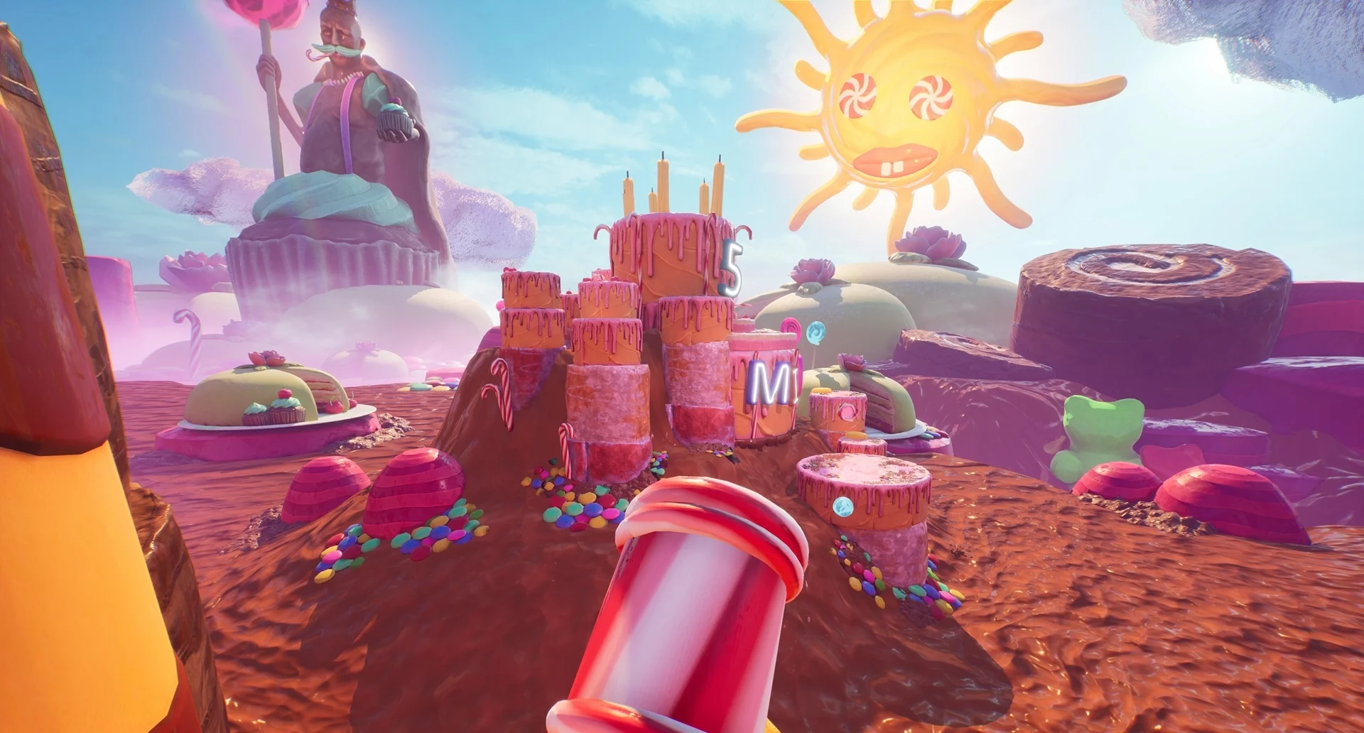Добравшись до первых ворот, активируйте две кнопки в виде леденцов, чтобы увидеть торт. Туда вам и нужно попасть. Преодолев сегмент с вращающимися вафлями, прыгайте на зеленых конфетах, чтобы проломить их. Повторяйте действия, следуя вперёд, затем забирайтесь в импровизированную пушку.