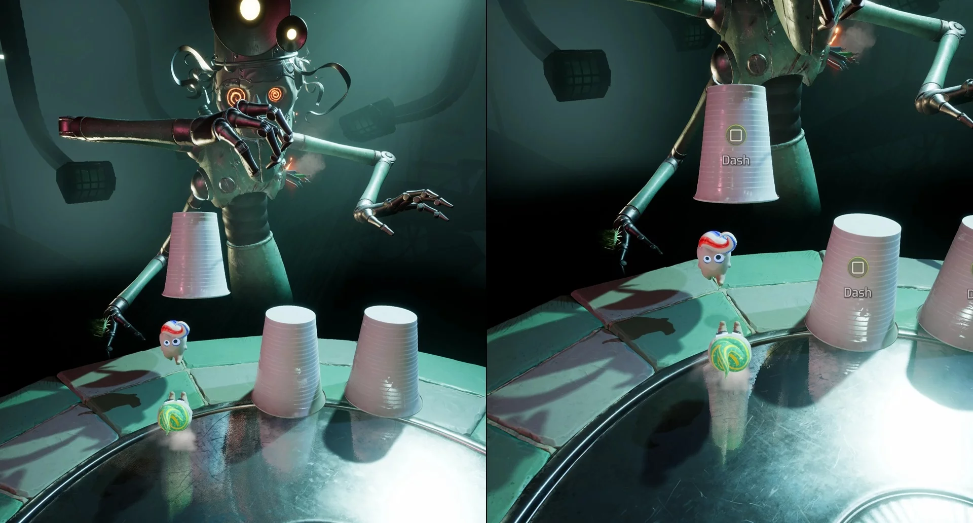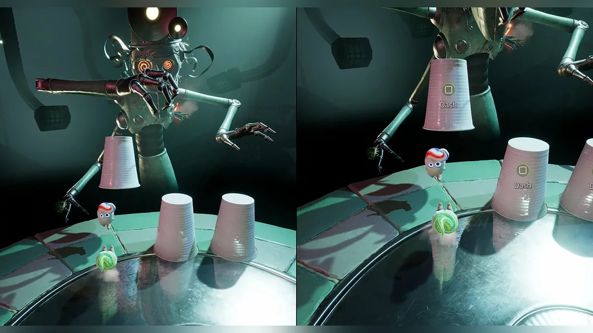 На следующей локации с помощью кислоты разрушьте цепи, удерживающие гигантский шар. Второй игрок должен с помощью рывка закатить шар в большую лунку. По такому принципу будут построены большинство головоломок в этом сегменте.