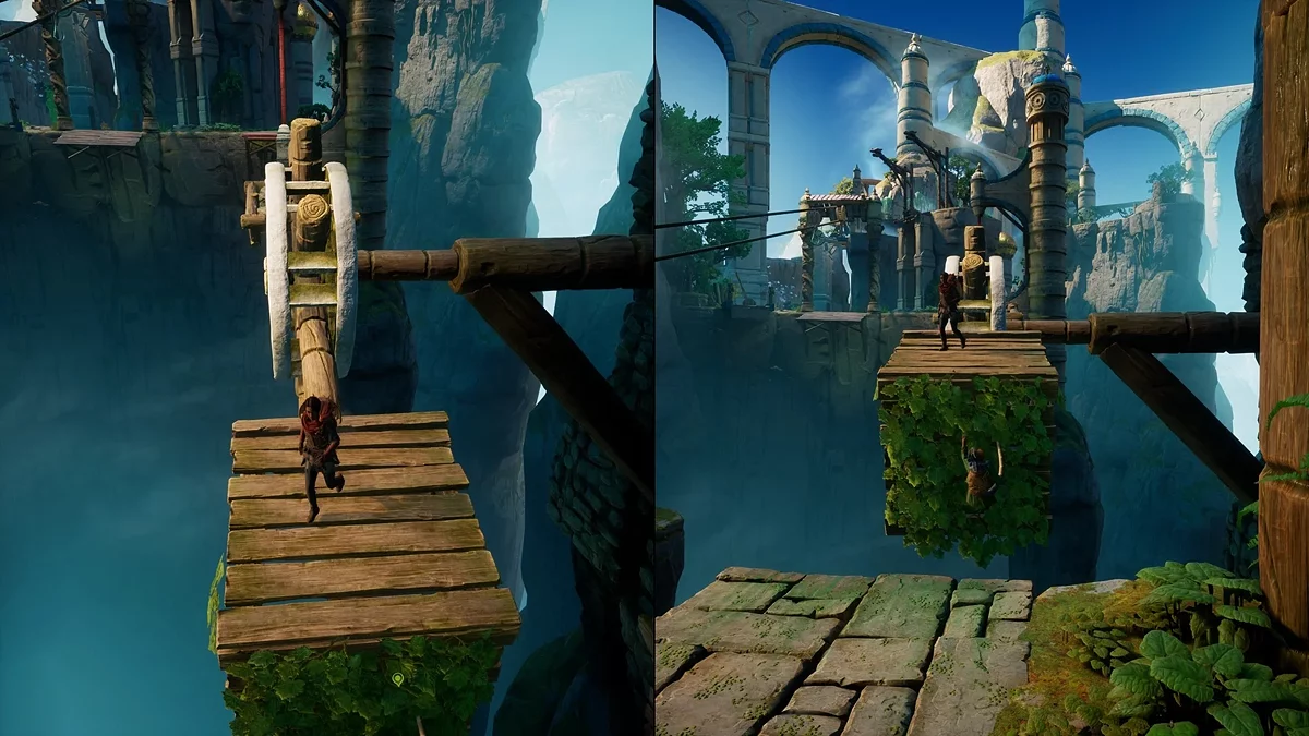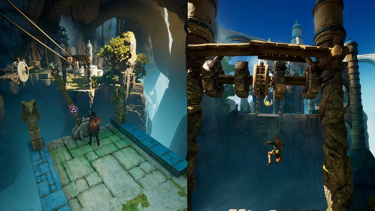 Далее Зои опускает платформу при помощи плюща, Мио забирается выше и планирует на другую сторону, чтобы активировать рычаг и подвинуть крюк ближе к Зои.