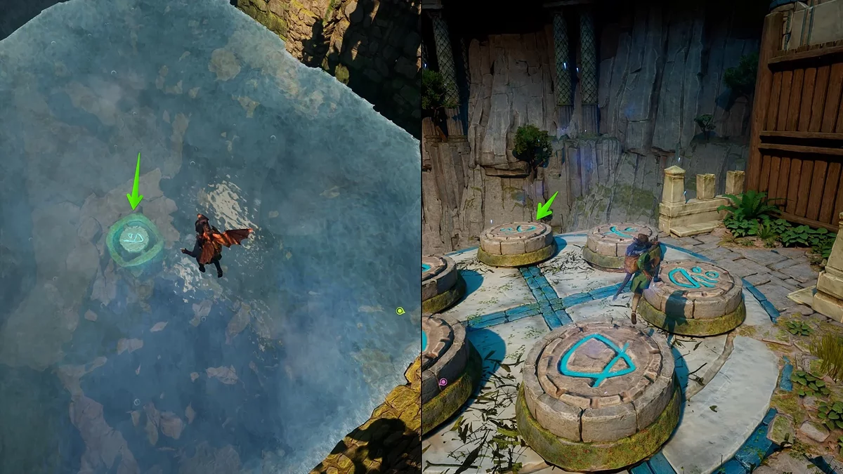 Так откроется проход. Хватайтесь за крюк и следуйте по единственному пути вперёд, преодолевая различные препятствия. Далее один из игроков поднимается на верхний уровень с кнопками, на которых изображены различные символы. Становитесь на символ, похожий на букву L — из-под воды появится колонна с потоком воды. Мио планирует к потоку воды и по такому же принципу следует на противоположную сторону. Обращайте внимание на символы под водой — на такие же кнопки нужно становиться игроку в правой части экрана.