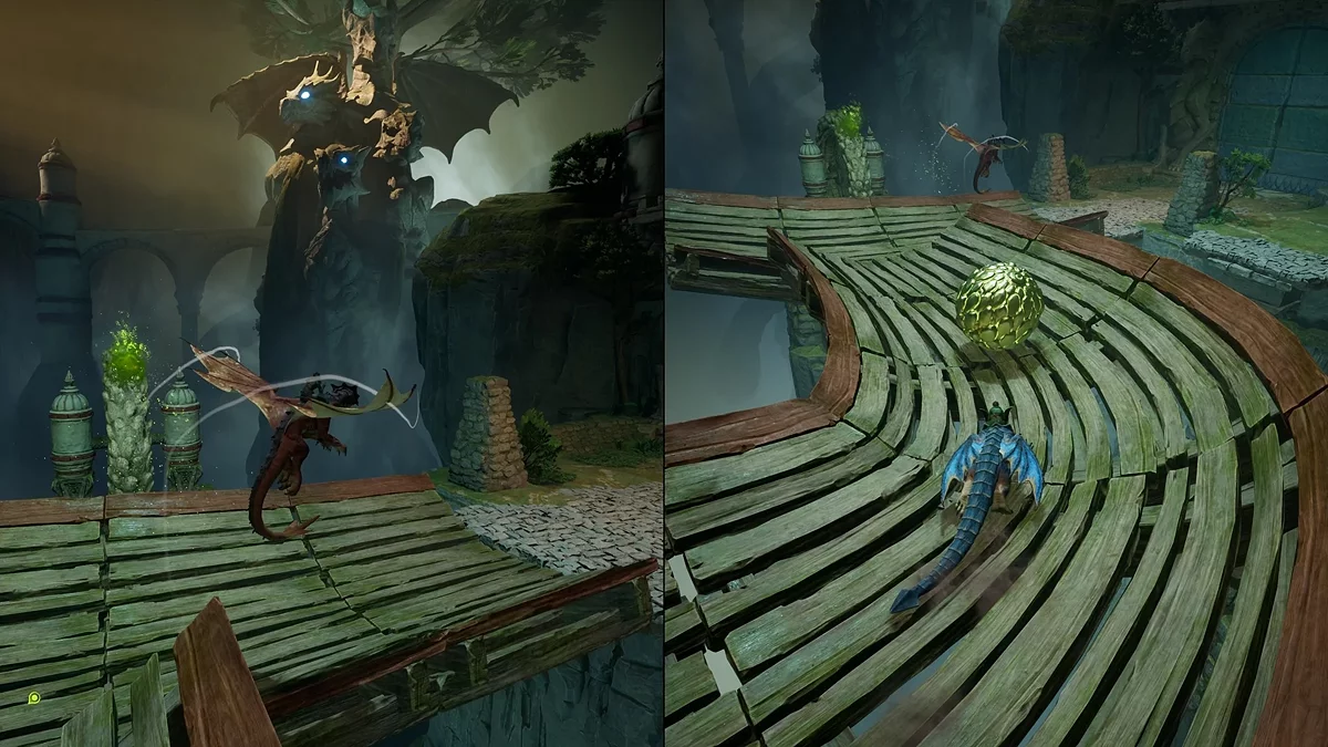 Так вы доберётесь до непростой головоломки. Игроки вставляют два яйца в колонну, отправляя энергию по каменному туловищу дракона. Теперь геймеру зеленого цвета нужно успеть добежать до следующей стойки. Его приятель направляется к двум стойкам в конце у большого яйца.