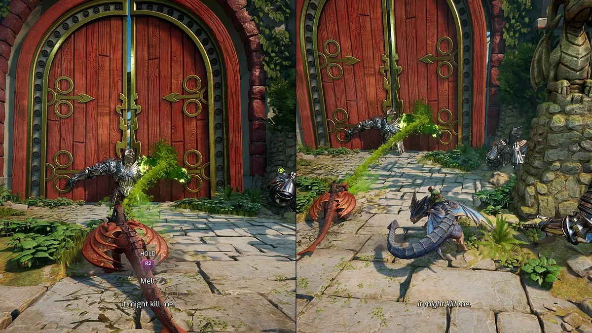 Как мы уже отметили, красный дракон может планировать (не летать полноценно), а синий — карабкаться по плющу. Помимо этого, у дракона Мио есть способность плевать кислотой, чтобы разрушать железо. Дракон Зои же может использовать рывок. Это позволит открывать запертые проходы и разрушать камни и кристаллы.