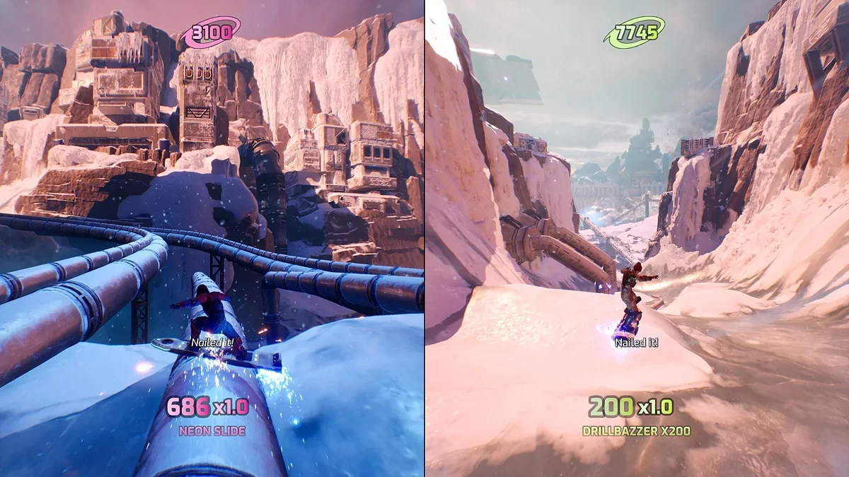 В этой побочной активности вам нужно двигаться на огромных сноубордах и набирать очки. Для набора очков выполняйте различные трюки.