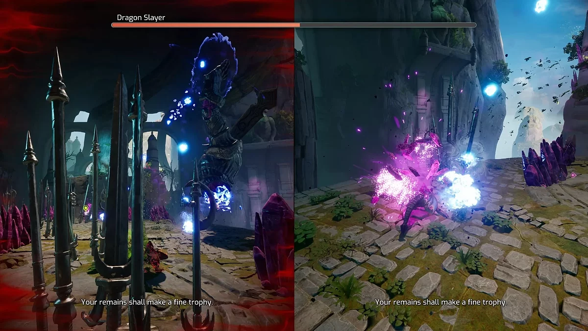 Когда окажетесь на спине гигантского каменного дракона, используйте свое новое оружие и разбивайте кристаллы, пробираясь вперед. Питомцы время от времени будут появляться, чтобы открыть вам доступ к наростам, — необходимо их быстро уничтожать. Сложностью станут появляющиеся позади движущиеся кристаллы. В этом случае одному игроку лучше продолжить наносить урон наростам, а второму — расправляться с кристаллами.